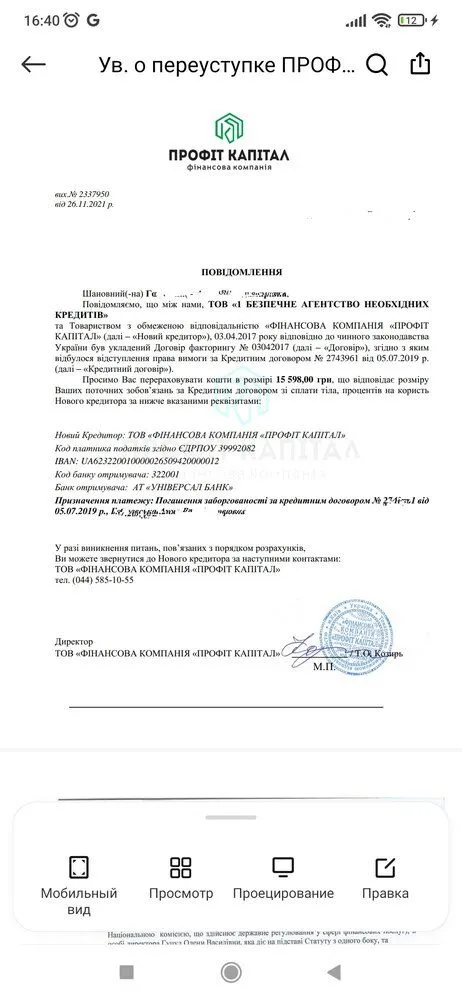 Запомните. Любая шарага, которая якобы купила ваш долг, остается никем, пока не будет укрпочтой заказным письмом (с уведомлением) отправлена копия договора. Как минимум. Просто представьте, вам выслали в электронном виде непойми что. Теперь непойми кто предлагает вам оплатить им деньги. А завтра объявится реальный кредитор. А? Я бы так не рисковала.