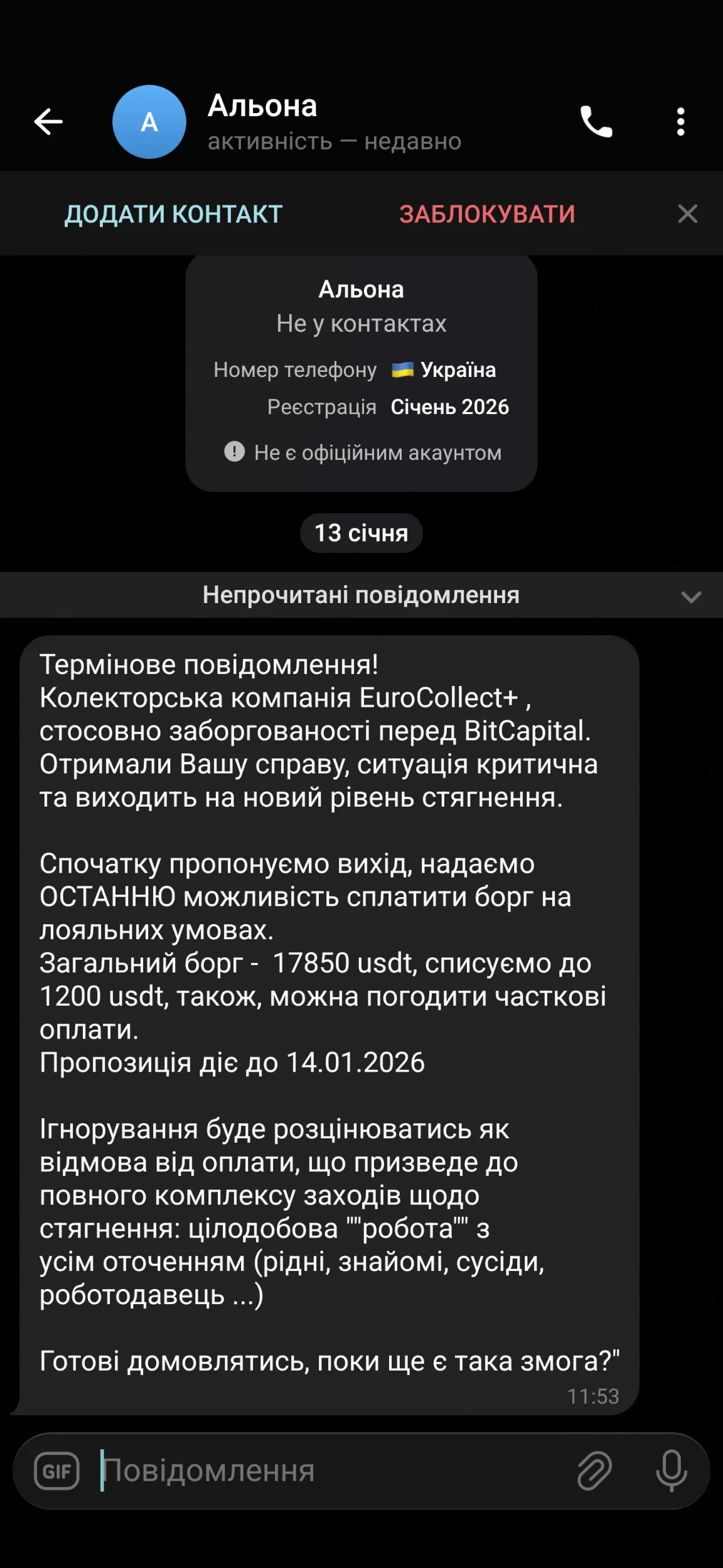 Євроколект я так розумію вони створили недавно, але вони зараз займаються дуже старими боржниками (з протермінуванням від півроку, рік, два) все починається з того, що телефонує нікчема, каже що з такої то компанії, і що викупили борг в біткепітал (насправді нічого вони не викуляли, це і є біткепітал), далі по стандарту «ви нам винні 200 тис доларів, але дайте 800 дол закриємо питання) після того як ви не погоджуєтесь, починається терор ( ну ви вже знаєте, підміни номерів, чати, фото та обзвін родичів , ну і так по колу) євроколект це ще одна дочірня компанія тих криптовиблядків)
