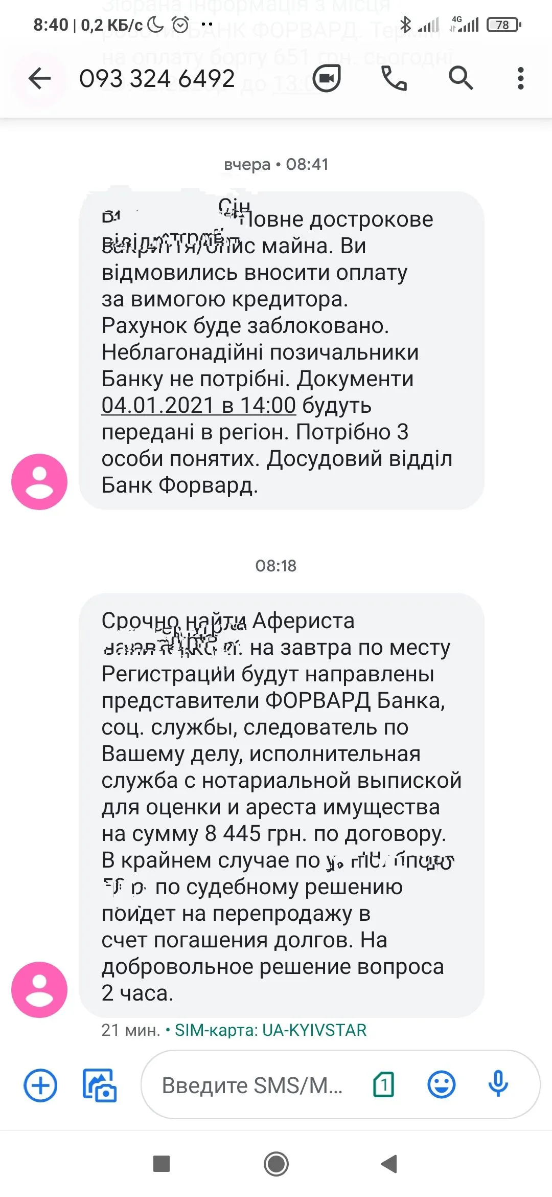 У меня сегодня другая бредовая смс от них была. Они в полицию меня сдавать собрались. А причина тому: оплата в неполном размере ежемесячного взноса по потребительскому кредиту.