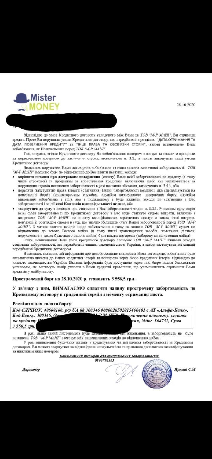Підкажіть будь ласка, які наступні них діі. Містер мані прислали у вайбер вже вдруге, прострочка десь близько місяця. Пролоногацій не робила. Платити зарез нема чим. Дзвінки ігнорю.