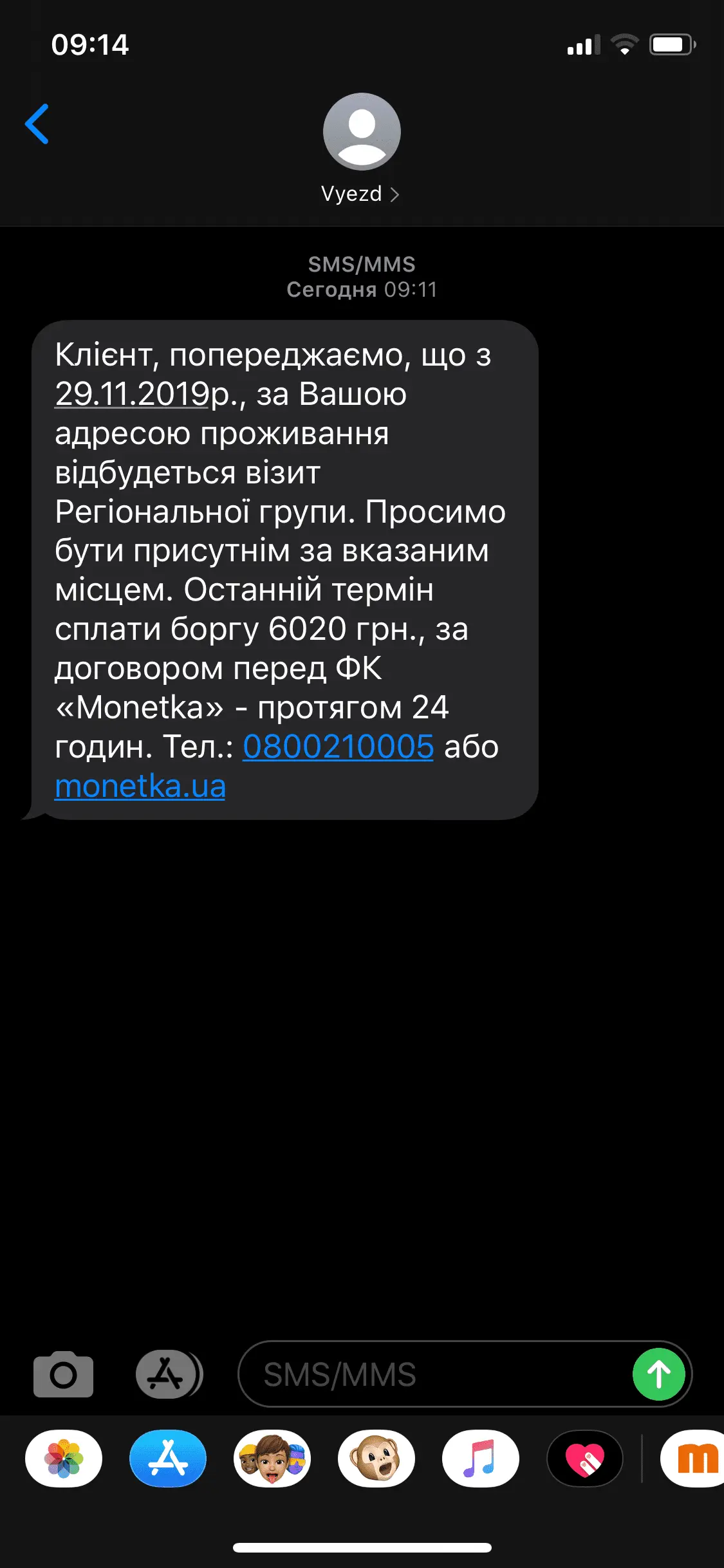 Клієнт, попереджаємо, що з 29.11.2019р., за Вашою адресою проживання відбудеться візит Регіональної групи. Просимо бути присутнім за вказаним місцем. Останній термін сплати боргу 5022 грн., за договором перед ФК «Monetka» - протягом 24 годин. Тел.: 0800210005 або monetka.ua. Точно такое сегодня прислали. Ай ай ай, а я как раз 29 уезжаю. Во блин.