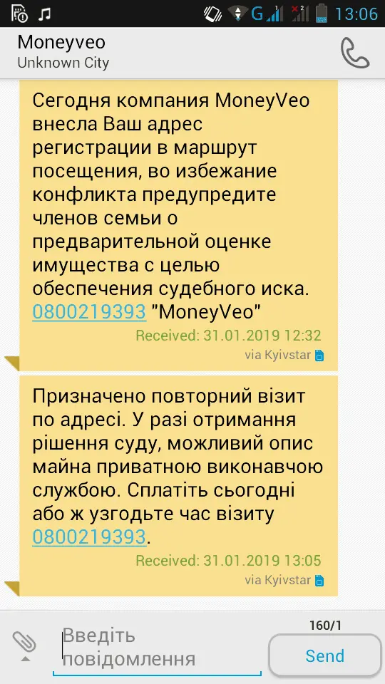 Сегодня компания MoneyVeo внесла Ваш адрес регистрации в маршрут посещения, во избежание конфликта предупредите членов семьи о предварительной оценке имущества с целью обеспечения судебного иска. 0800219393 "MoneyVeo" мени також прийшло, чи справди приидуть.