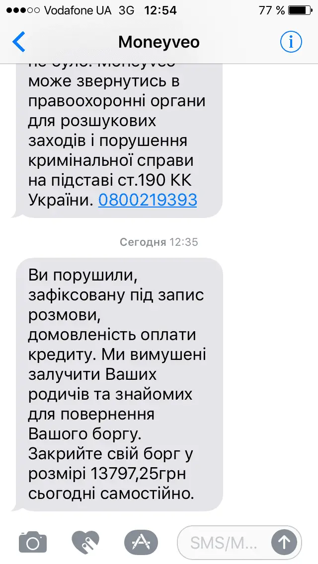 И мне: Ви порушили, зафіксовану під запис розмови, домовленість оплати кредиту. Ми вимушені залучити Ваших родичів та знайомих для повернення Вашого боргу. Закрийте свій борг у розмірі 21050,40грн сьогодні самостійно.А мне такое пришло. Тело 5830