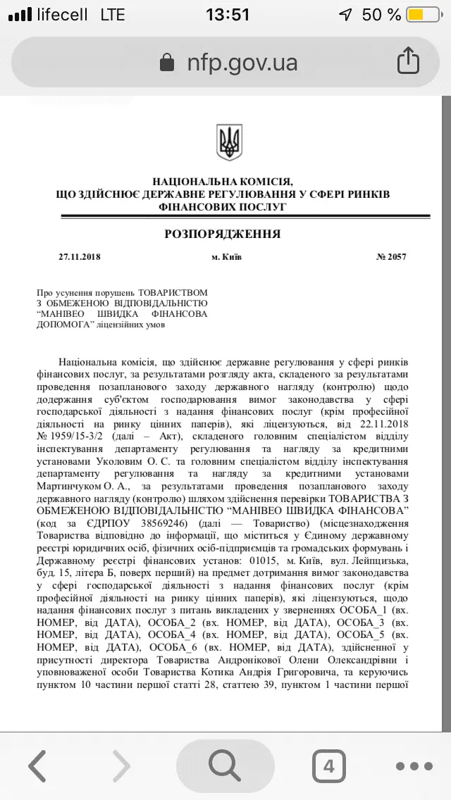 Надо зайти посмотреть,потому что как раз собралась писать в нацкомфин на этих ypoдoв....их звонилка постоянно твердит,что у них лицензия от нацкомфина и все с ними договорено....А кто то видел,походу и манивео проверяли нацкомфинуслуги, потому что на сайте нацкомфинуслуги про них уже написали. У них нарушения лицензионных требований.