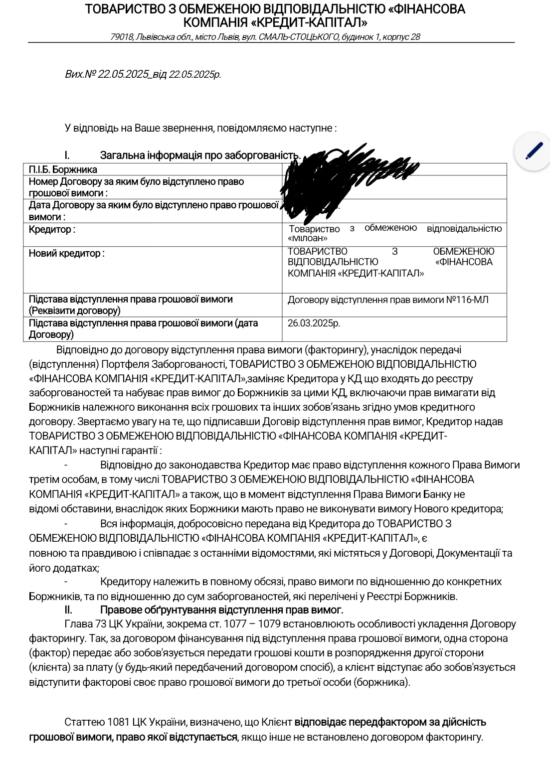 Відповідно до законодавства Кредитор має право відступлення кожного Права Вимоги третім