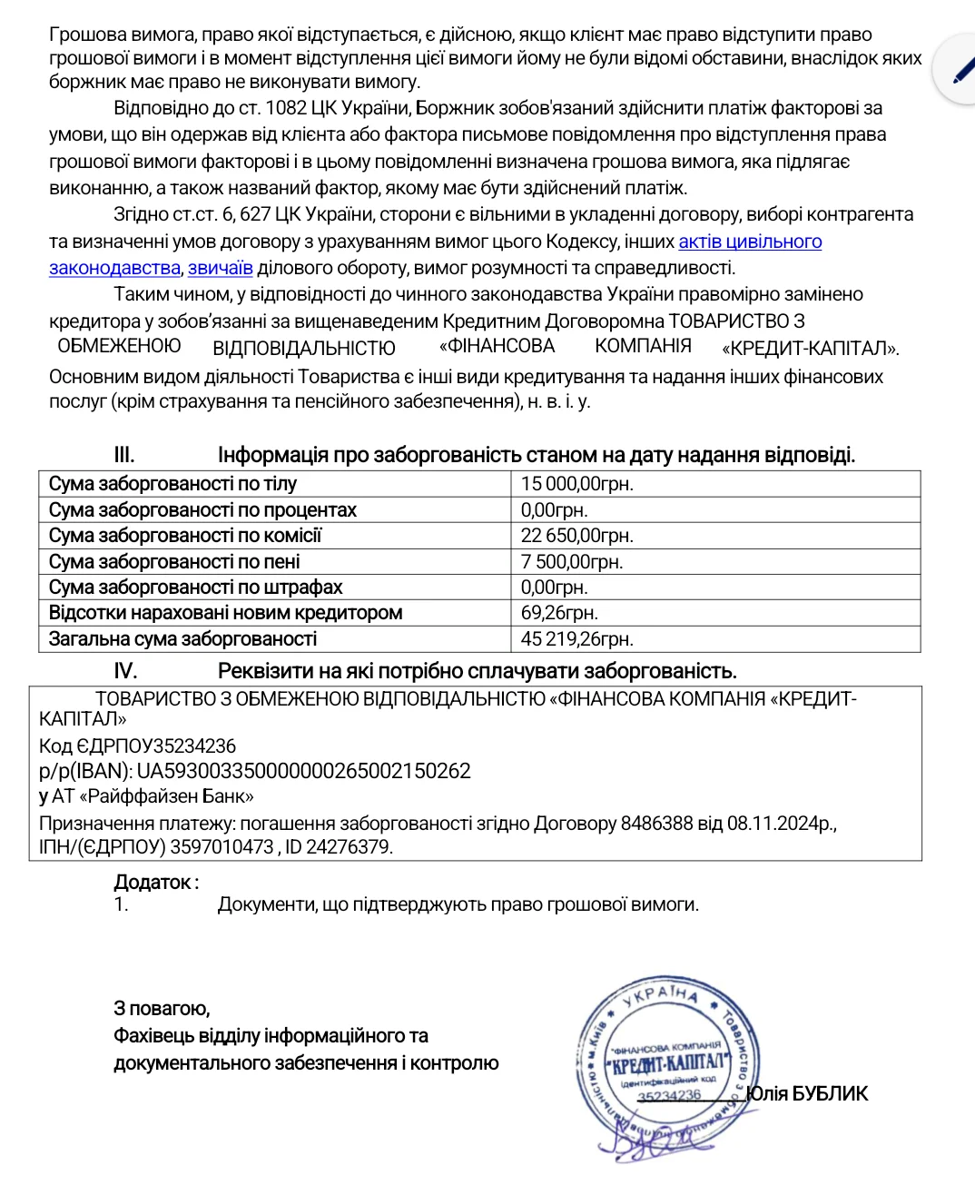- Вся інформація, добросовісно передана від Кредитора до ТОВАРИСТВО З ОБМЕЖЕНОЮ