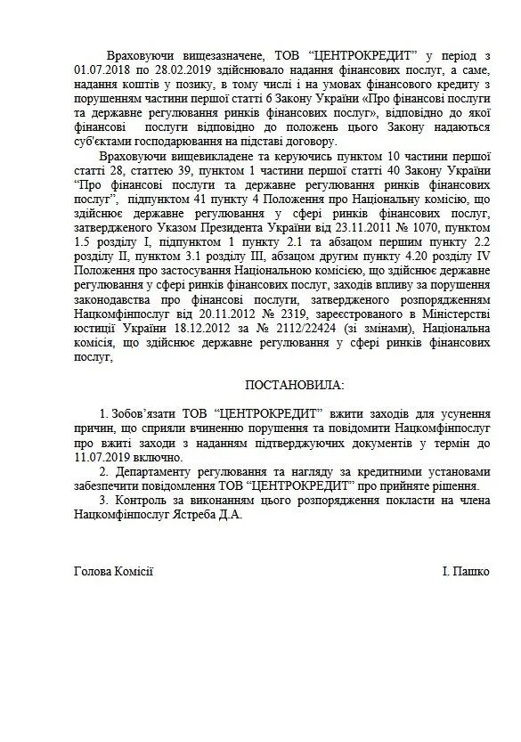Привет))Вообщем так))На центрокредит писала в Нацком(не помню точно число,в 5 месяце)пришёл ответ,(нарушения в електронной подписи,как-то так...)я про них и забыла(написала,чтобы заткнулись,на помощ нацкома не рассчитывала)Около месяца назад пришло СМС,что отдали кредит експресс.Думаю зайду гляну в кабинет.С 2800-20000 так и висит.Калы предложили закрыть за 4000(с копейками, около 5000)Написала опять в Нацком.Пришёл ответ,что я уже писала им по центрокредит и есть решение на сайте нацкома.Само решение не могу ни открыть ни скачать(телефон старый,не поддерживает((Но внизу написано под решением"Не виконано"Это что значит???И если кто может,гляньте пожалуйста, там 11.06 2019 (вроде)Центрокредит.Спасибо.