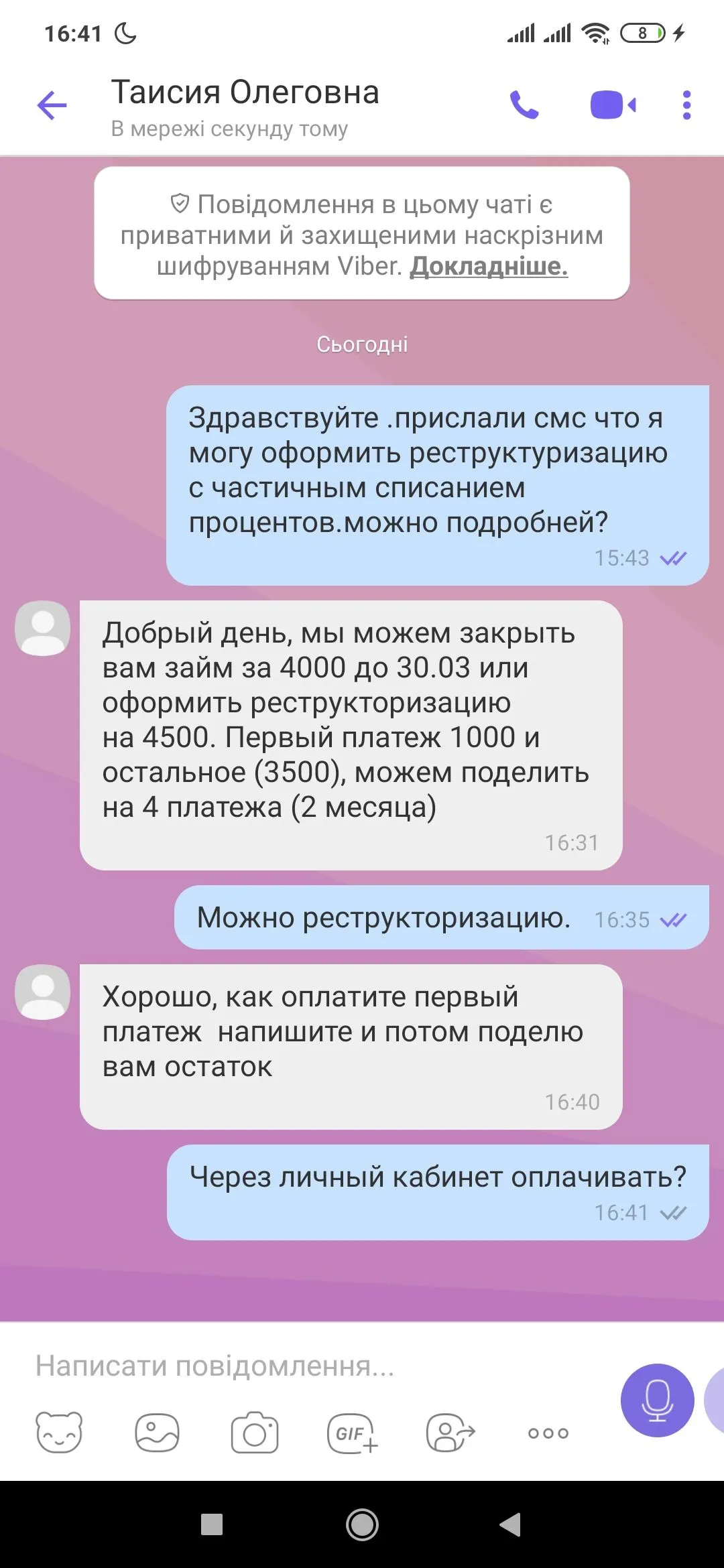 В связи с карантином, компания предлагает закрыть Ваш долг оплатив 2 тела займа или оформить реструктуризацию долга с частичным списанием процентов. Детальная информация по телефону и VIBER 0636025072. Таисия Олеговна