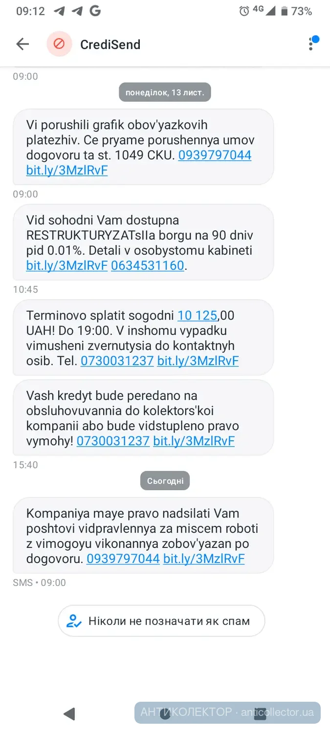 В мене кредитсенд, протермінування більше місяця.Прийшла смс,що передано в роботу колекторів промколект.Самі на поступки не йдуть,хочуть щоб заплатила відсотки.Незнаю що від них чекати.Доброго явно нічого.