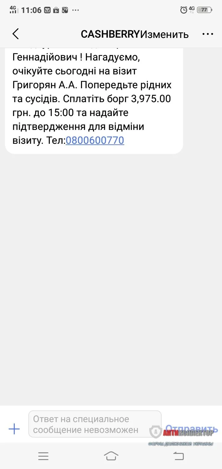 Нагадуємо, очікуйте сьогодні на візит Григорян А.А. Попередьте рідних та сусідів. Сплатіть борг до 15:00 та надайте підтвердження для відміни візиту. Тел:0634891315