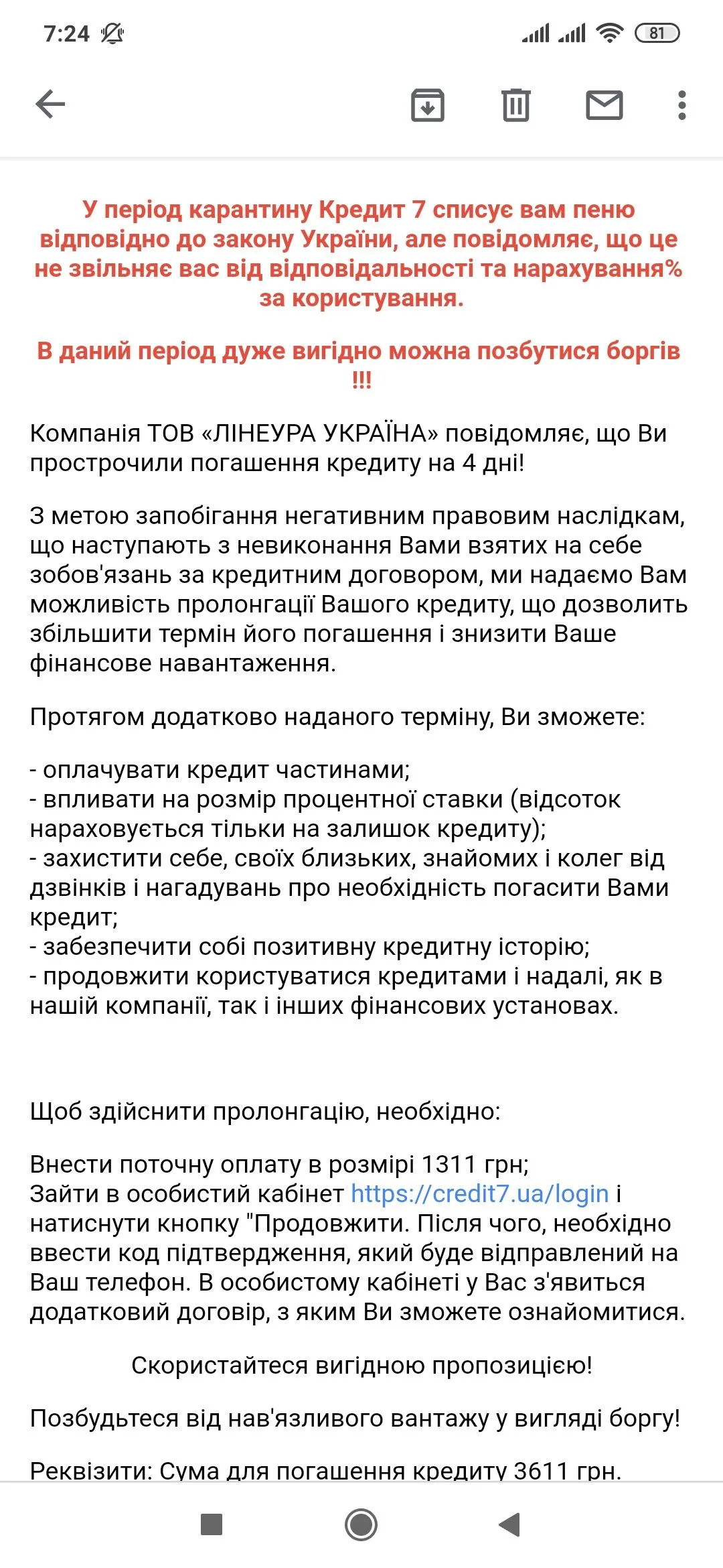 Вчора написала звернення нацком з приводу кредит каси. Попросила перевірити правильність та законність договору, вказала суму передплат. Попросила про повернення надміру сплачених коштів по зобов’язанню. Відповіді на пошту не було , але зайшовши в кабінет сьогодні, побачила що вся історія оплат зникла , % не нараховується , залишилося лише тіло кредиту яке маю сплатити наступного тижня. Хотілося б звісно повернути кошти, бо «годувала» я їх достатньо!