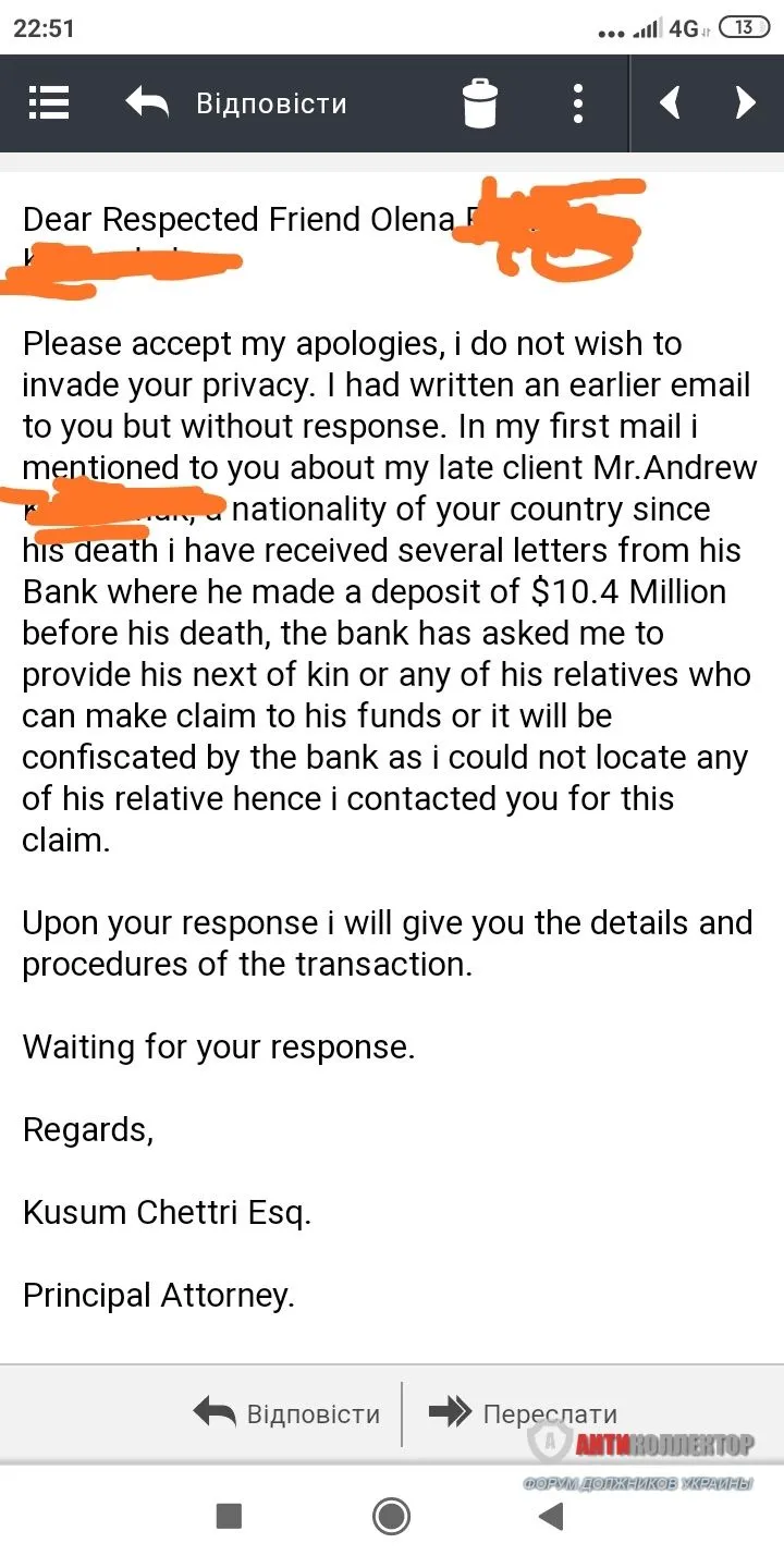 Пожалуйста, примите мои извинения, я не хочу вторгаться в вашу конфиденциальность. Я написал вам электронное письмо ранее, но без ответа. В моем первом письме я упомянул вам о моем покойном клиенте г-на Эндрю (моя фамилия!), который является гражданином вашей страны с момента его смерти. Я получил несколько писем от его Банка, где он внес депозит в размере 10,4 млн. Долл. До своей смерти, банк спросил меня предоставить своих ближайших родственников или любого из его родственников, которые могут претендовать на его средства, или они будут конфискованы банком, поскольку я не смог найти ни одного из его родственников, поэтому я связался с вами по этому требованию.