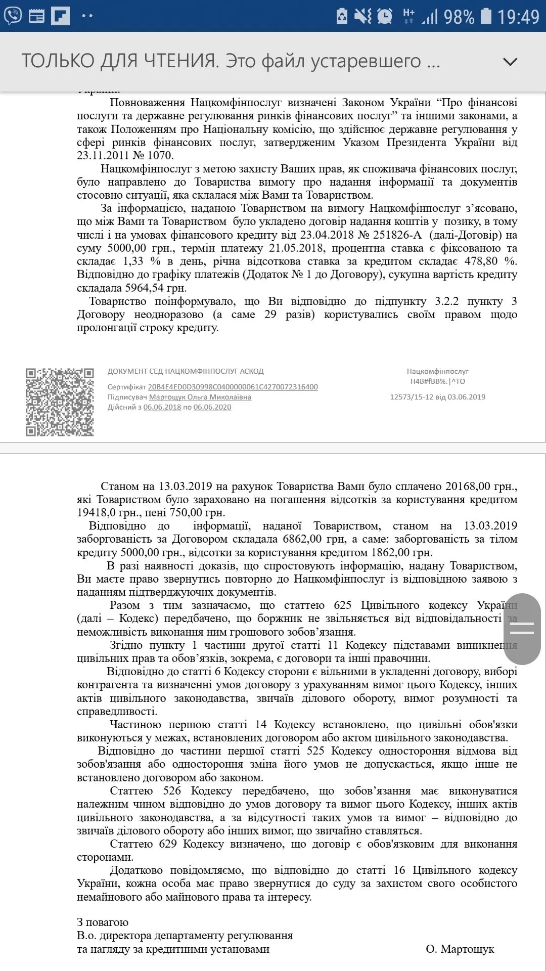 Нет. Я переписывалась в вайбере с их индюком недоразвитым, который нашёл каким то образом дальнюю подругу. После написала в нацком. Два раза не предоставили документы и третье вот такое же письмо пришло, что у них сбой в системе и нужно оплатить только тело и проценты. Больше не звонят, но раньше за два месяца просрочки задолбали всехВы им ответ никакой не давали?