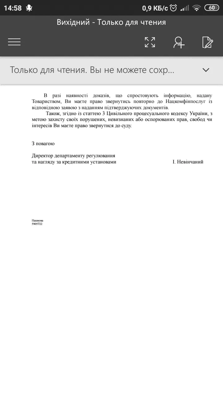 и что они вам больше не звонили ?Я писала. Первый ответ был, что они не предоставили информацию и срок рассмотрения заявления продлён ещё на 15 дней. 6 ноября пришёл ответ, что у меня с ними нет договора
