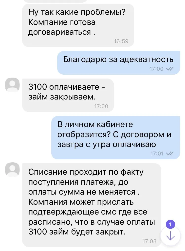 Говорю, правду, что у меня много МФО, и плачу пока тем, которые согласились тело+проценты за месяц по договору. Вообщем говорит компания готова договариваться, сошлись на 3100. Боюсь, что кинут. Посоветуйте как быть?