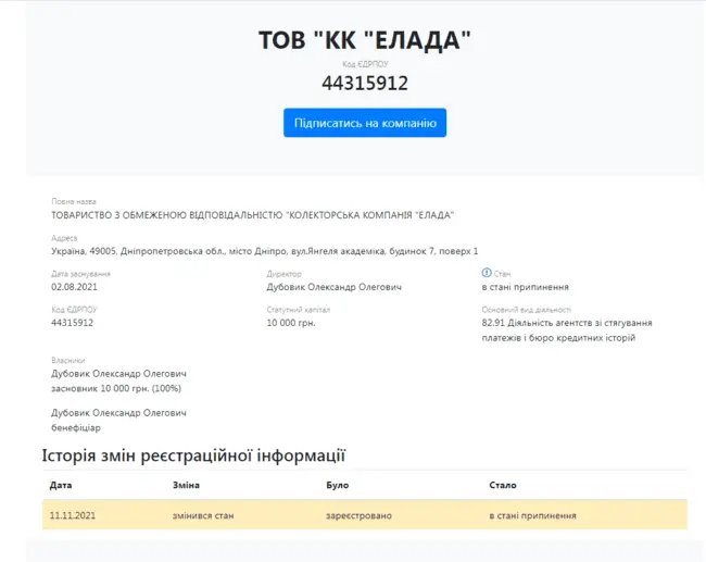 Незаконная коллекторская компания ТОВ КК Эллада, основанная 2 августа 2021 года, не выдержала прессинга активистов, НБУ и спецназа, и приняла решение самоликвидироваться.