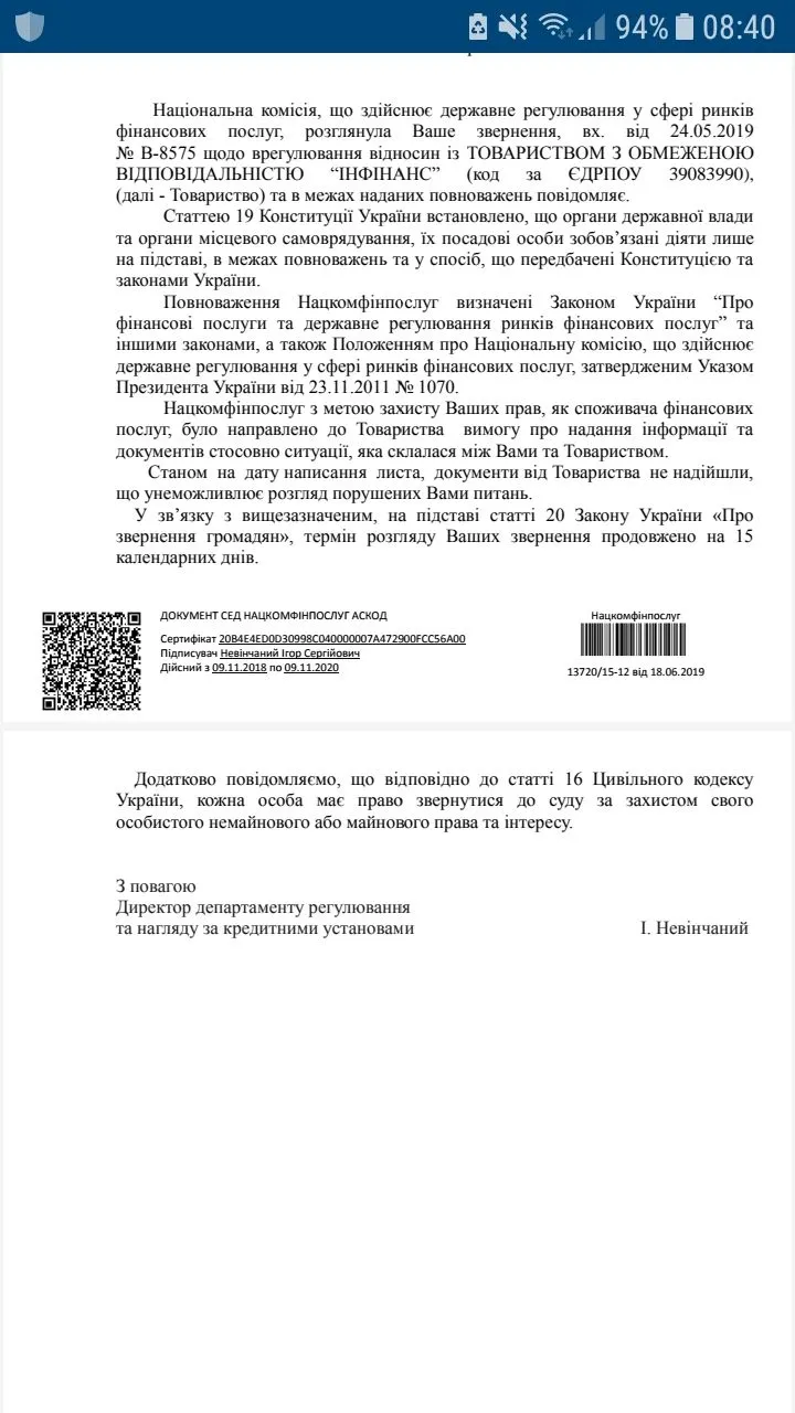 Ребята, каждый раз, когда МФО не дает документы на запрос Нацкомфина, составляется акт о правонарушении и их штрафуют на 17 тысяч грн. А судя по ответу у Вас просят еще 15 дней на обработку. Ждите, может и подадут в течении 15 дней