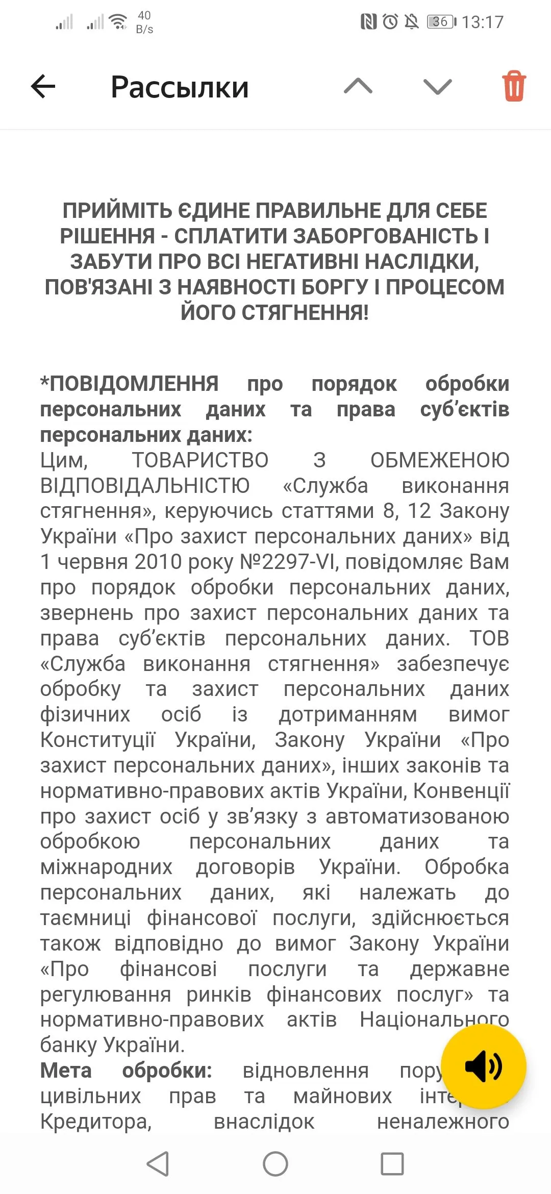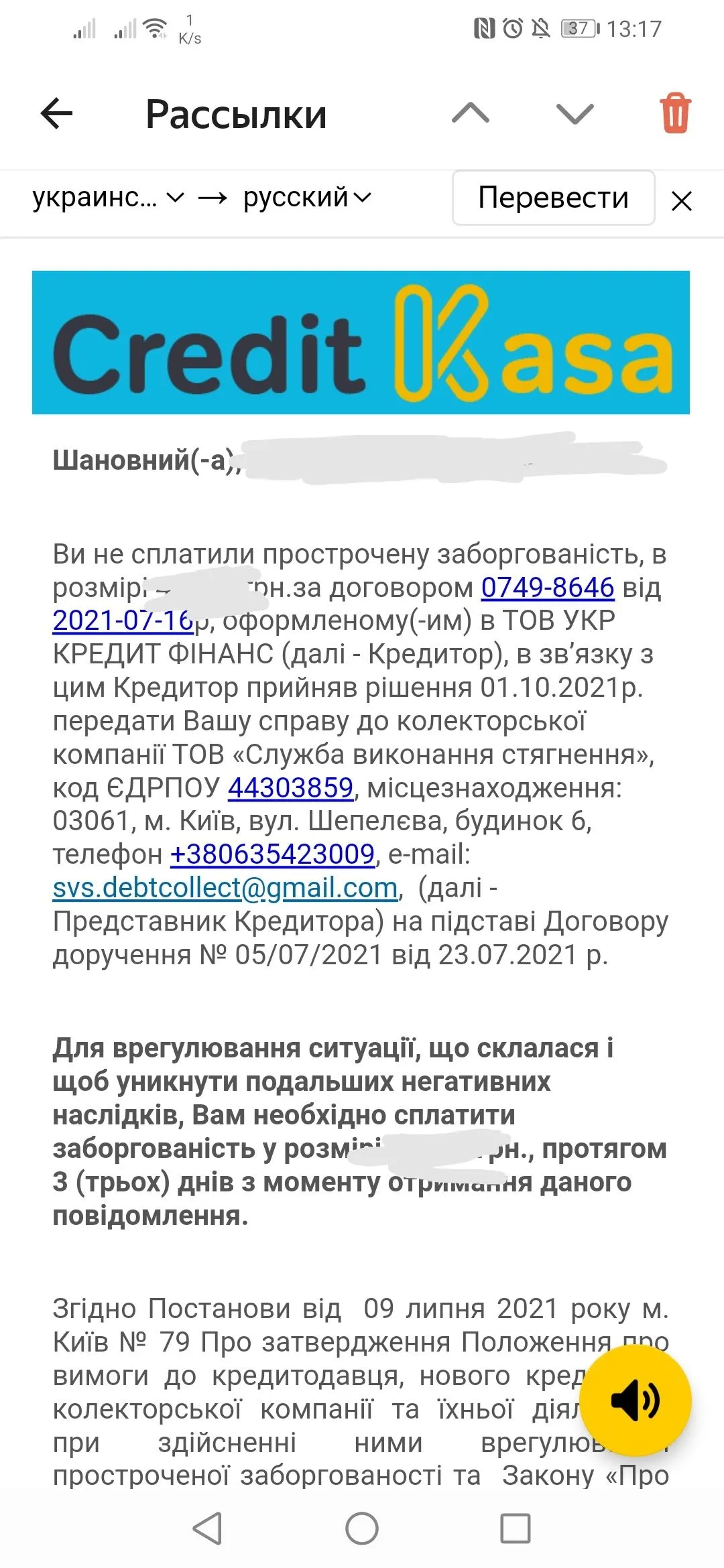 Доброго дня, сьогодні на Вайбер прийшла смс від Кредит Касси,просрочка більше місяця,вони можуть так швидко це зробити чи лякають?Мене звати Боднар Ксенія Романівна, фахівець відділу по роботі з простроченою заборгованістю ТОВ “Укр Кредит Фінанс” Компанія Creditkasa. Юридична адреса компанії м. Київ, бульв. Лесі Українки, 26, оф. 407. номер вхідної лінії +380931707377. Ви маєте прострочену заборгованість та порушили умови кредитного договору № 0749-7504 . І вам потрібно внести 8 417.50 грн . Через прострочку компанія має право звернутись до приватного нотаріусу для отримання виконавчого напису, для цього нам достатньо передати документи про отримання займу та факт перерахування коштів на рахунок клієнта. Після вчинення виконавчого напису нотаріуса звертаємось до приватної виконавчої служби для стягнення боргу в повному обсязі шляхом накладення арешту рахунків, вони більш зацікавленні в стягненні боргу ніж державні, тому що отримують відсоток та більшу зарплатню. Виконавчий напис нотаріуса регулюється Законом України «Про нотаріат» (глава 14) та постановою КМУ №1172, можете ознайомитись самі. Через що надійде оплата, для уникнення небажаних наслідків по кредиту?