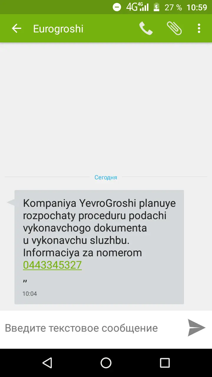 Сегодня Еврогроши прислали такое смс "Kompaniya YevroGroshi planuye rozpochaty proceduru podachi vykonavchogo dokumenta u vykonavchu sluzhbu. Informaciya za nomerom 0443345327