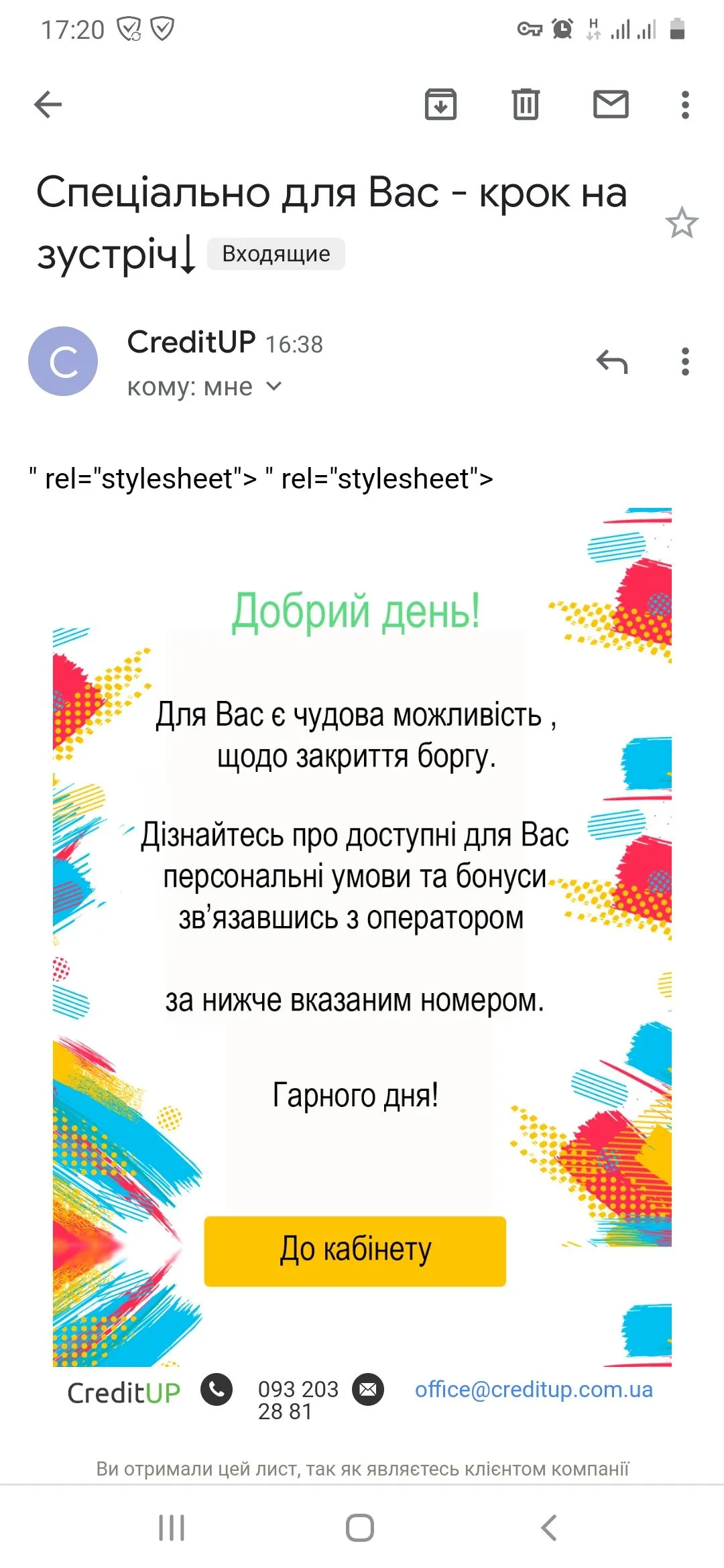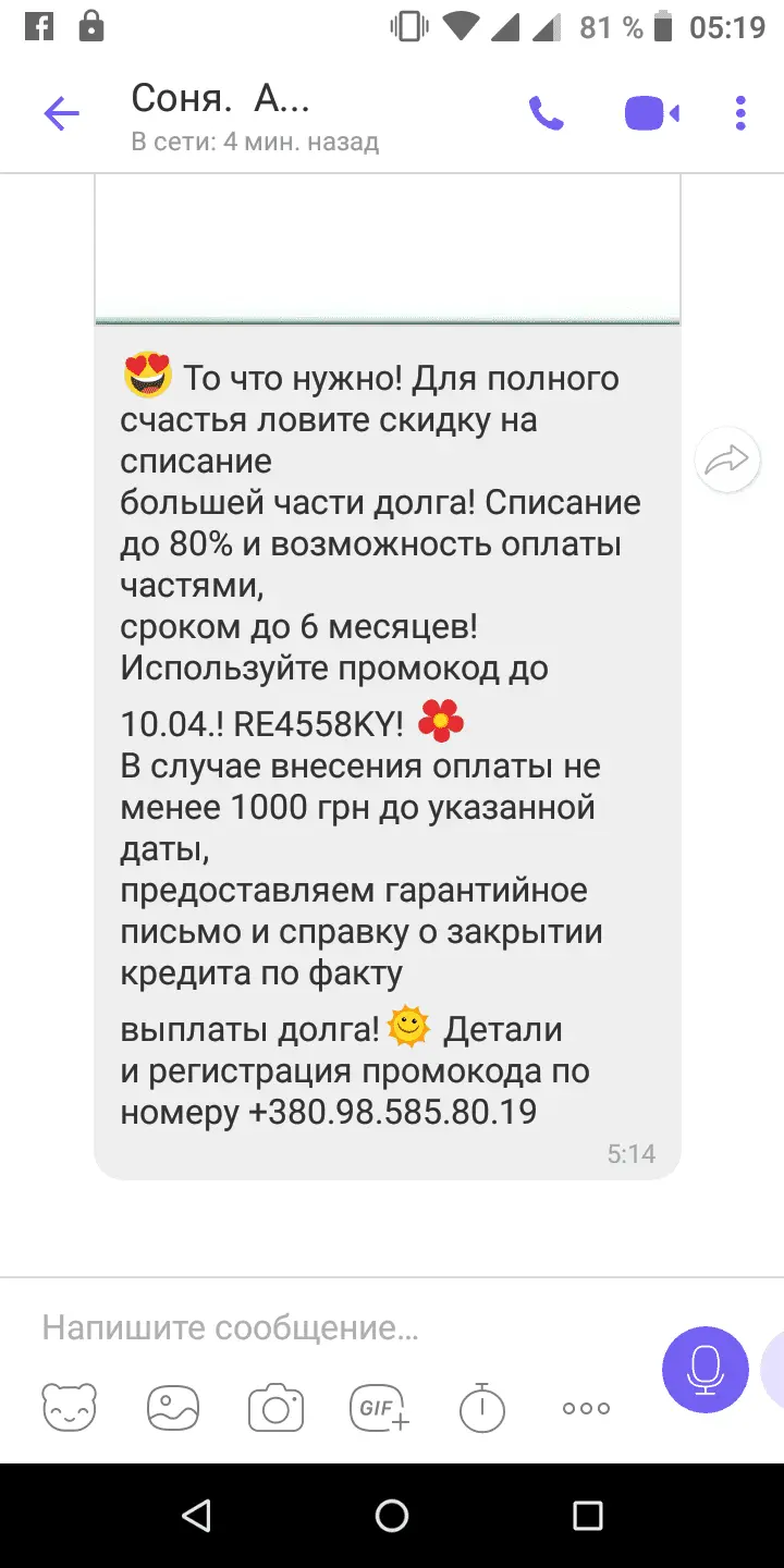 На вайбер написал сотрудник КредитАп (в дальнейшем, после нашего с ним разговора, как оказалось, достаточно культурный). Предложил списание имеющихся процентов, а сума там не маленькая. Сказал что пришлет на электронную почту гарантийное письмо, так же это гарантийное письмо продублирует мне на вайбер. В личном кабинете по его словам сумму они поменять не могут, потому что у меня очень длительная просрочка чуть больше двух лет. Но если я выплачу сумму на которой мы сошлись кредит мне закроют.