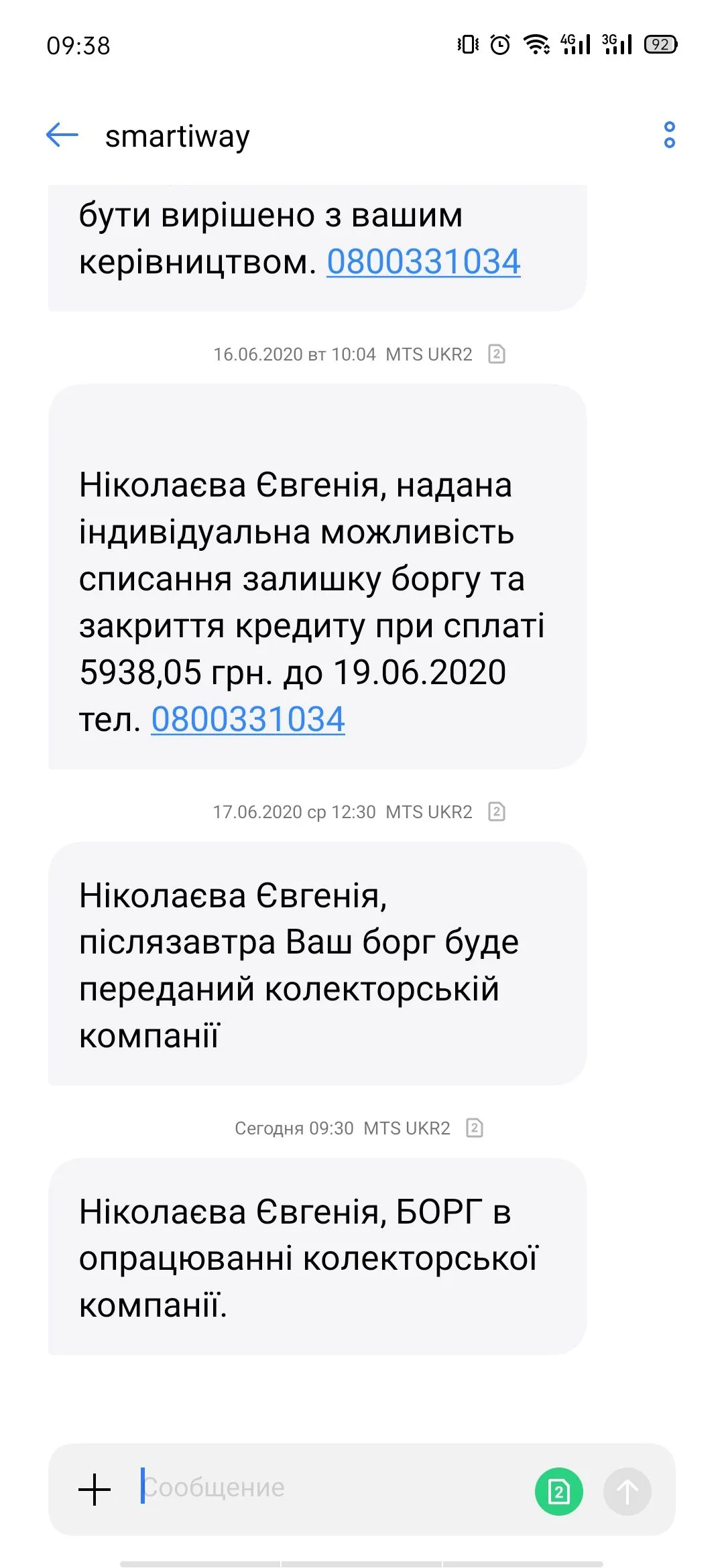 Взял я кредит в Смартивэй ещё до карантина. Тело 5,4к грн, делал раз пролонгацию на 1.8к грн. Просрочка началась 0.3.04.2020. Много звонили мне и слали СМС. По телефонной книге они только получили номер матери, и то им это не очень помогло. Мама поняла, и не поднимает трубку на неизвестные номера. Хотя и сейчас не много боится, что приедут имущество заберут и т. д. Я их тоже поставил на игнор. Сначала думал договориться, но потом понял что это нулевое дело. Слали СМС, угрожали полицией, что пришлют лист на работу, хотя с карантином работы не стало. Но сегодня прислали такую СМС "_