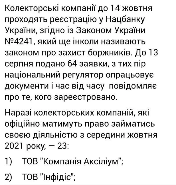 У вас информация сильно устаревшая. На данный момент 53 коллекторские компании. Вчера добавились КА ФакторСписок офіційно зареєстрованих колекторський компаній.