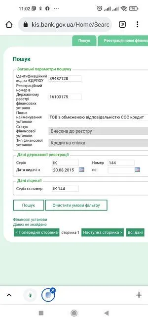 Natalochka, Пошук небанківських установ здесь все реестры