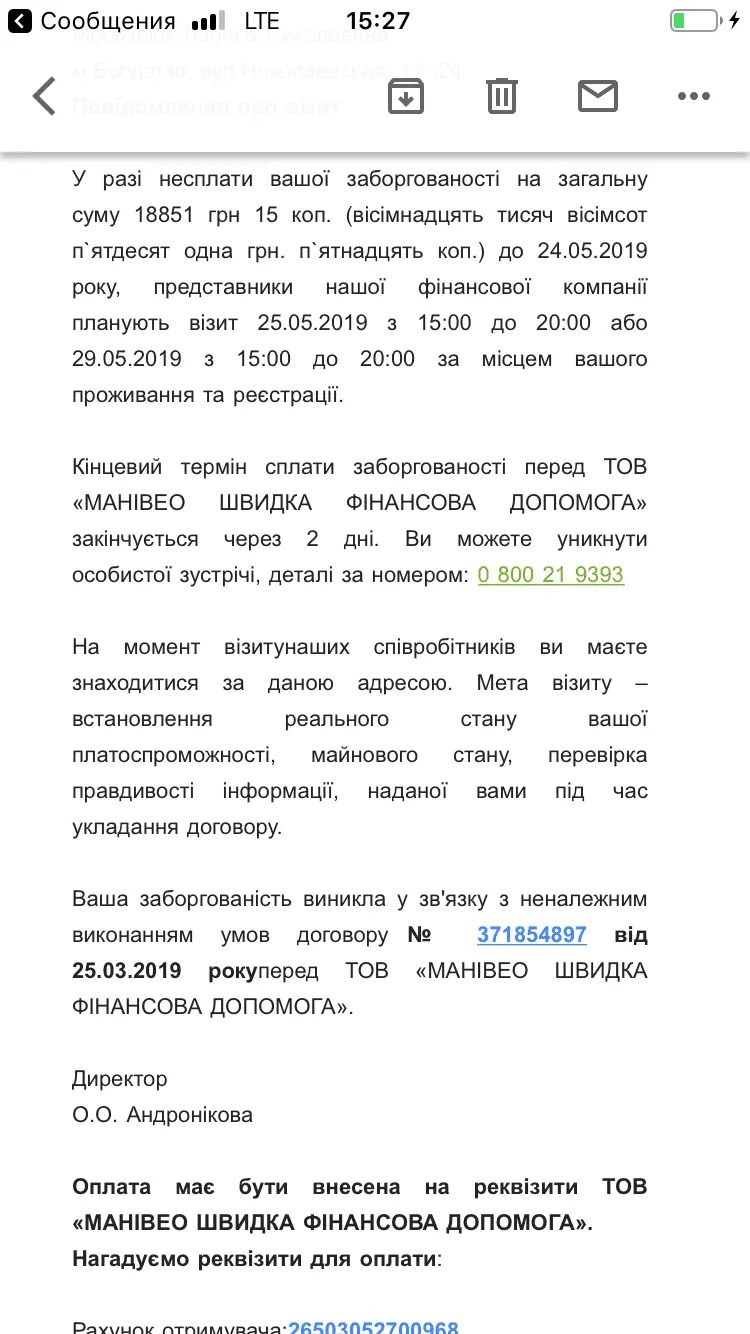 Вас попереджали про можливість залучення родичів для сплати 8545,26 грн в Манівео. Термін очікування на добровільне погашення боргу вичерпано. Очікуйте відповідальність за порушення умов договору. Деталі 0800219393