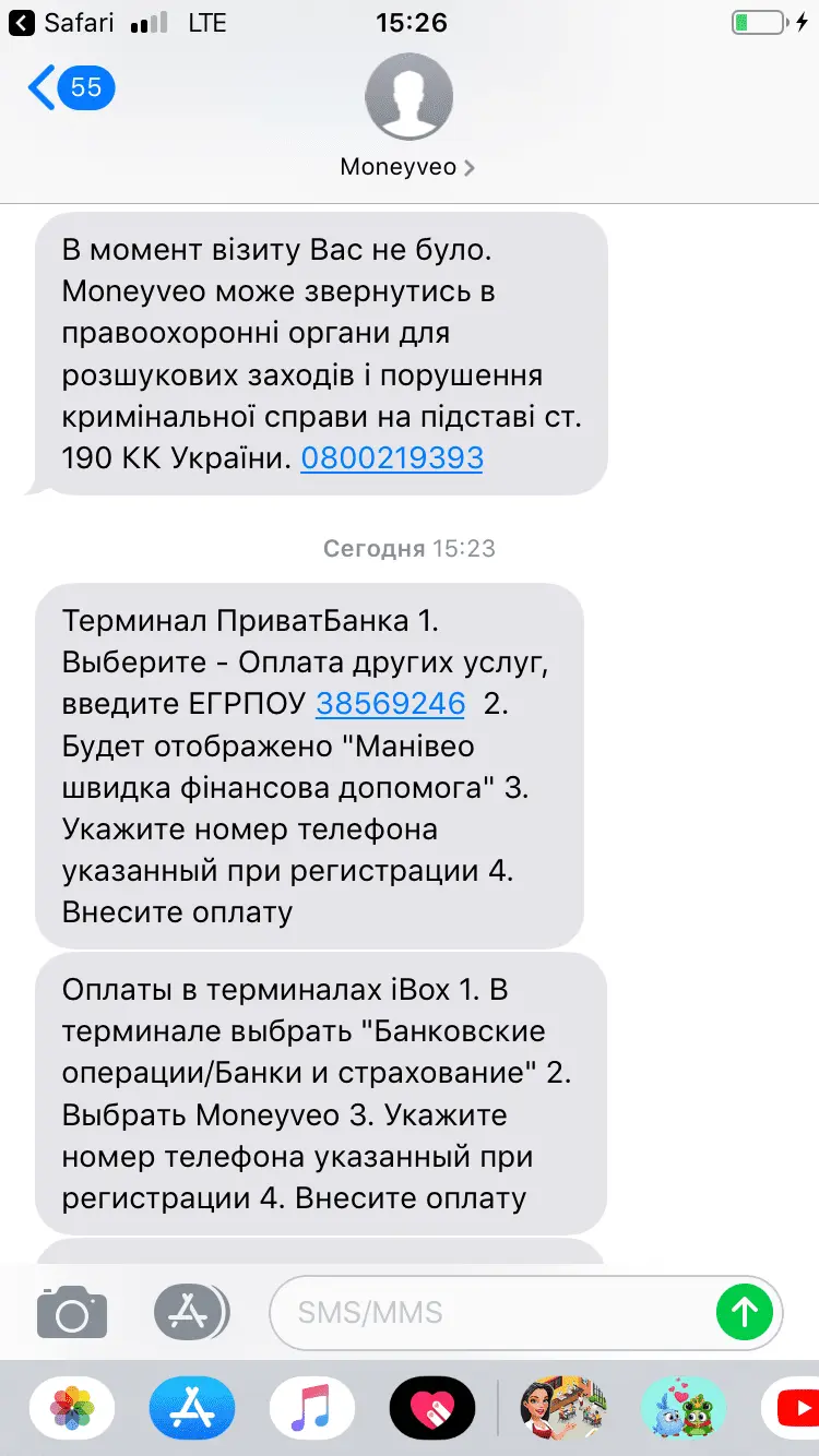 Ось, що мені вже сьогодні Манівео прислали:Ви порушили, зафіксовану під запис розмови, домовленість оплати кредиту. Ми вимушені залучити Ваших родичів та знайомих для повернення Вашого боргу. Закрийте свій борг сьогодні самостійно.