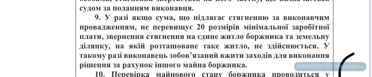 - забороняється звертати стягнення на єдине житло боржника, якщо сума боргу не перевищує 432 тисячі грн (50 мінімальних заробітних плат); Джерело: https://censor.net/n3609307