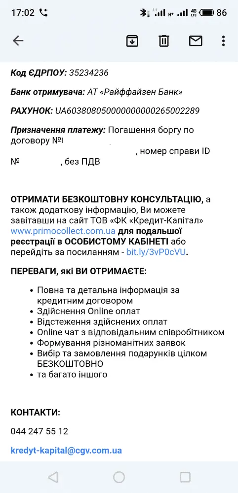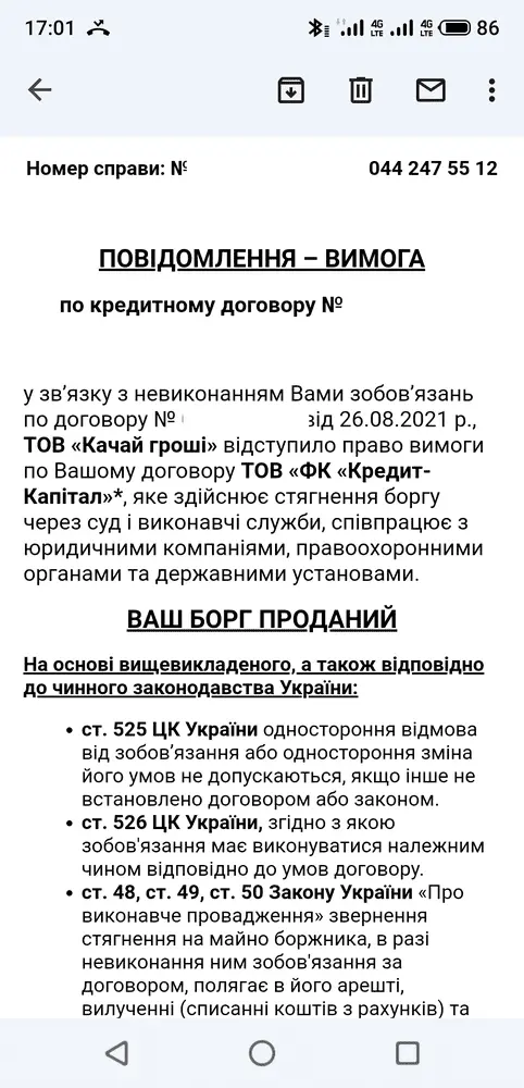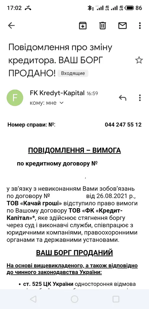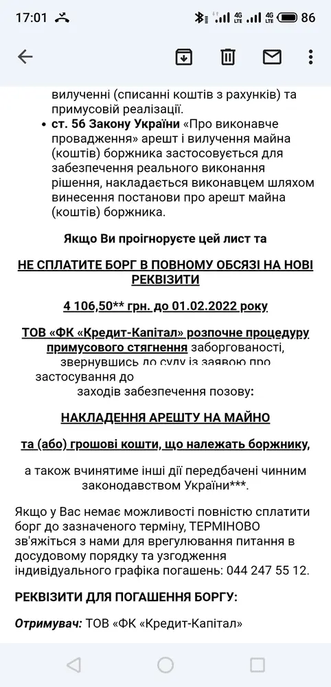 От FK Kredyt-Kapital пришло письмо-требование, в котором меня предупреждают о том, что мой %р+дит продан и о последствии неуплаты суммы 4106,50 грн.