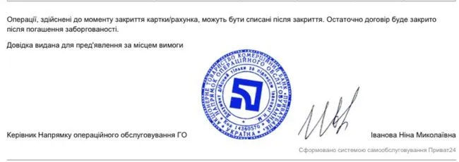Операції, здійснені до моменту закриття картки/рахунка, можуть бути списані після закриття. Остаточно договір буде закрито після погашення заборгованості.