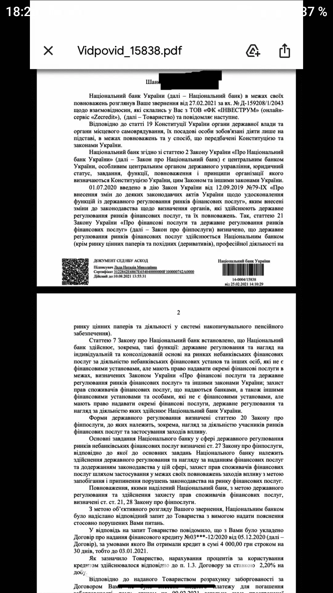 Добрый день. Пришёл ответ от НБУ по ZeCredit не совсем понятно что они имеют ввиду