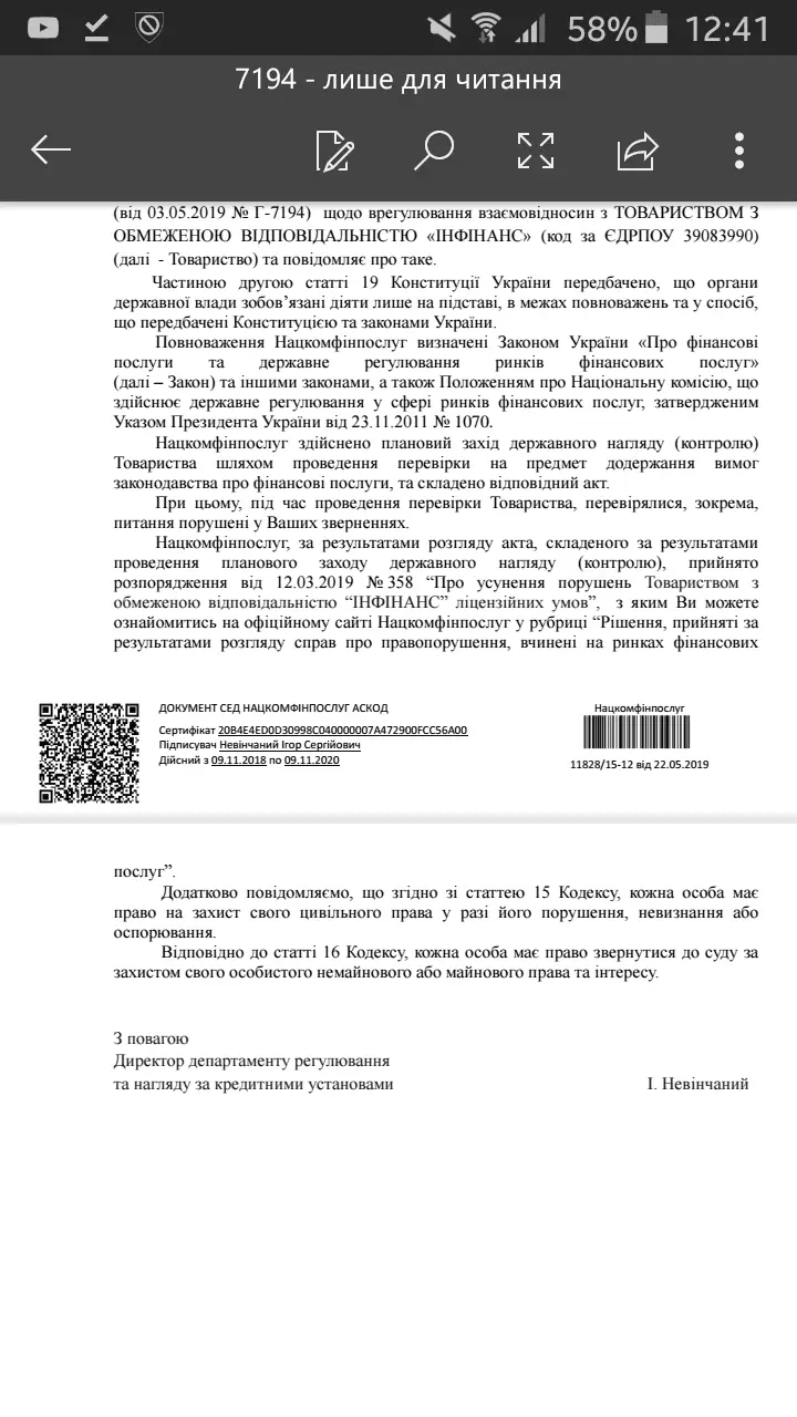 Мне комиссия прислала что вообще договора нет с МАНИБУ)) они так себя называли, после звонка в их контору, они сказали что бы я подавал в суд, а если не подам они будут и дальше писать и звонить..... Так что им на Нацком насрать... И в суд подавать мой юрист не советует, потому что говорит очень все долго будет, и ничего не произойдёт.. Так что все, я считаю что у меня этого МФО нет, хотя и про другие так считаю))