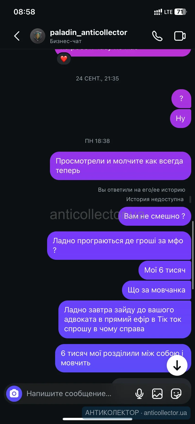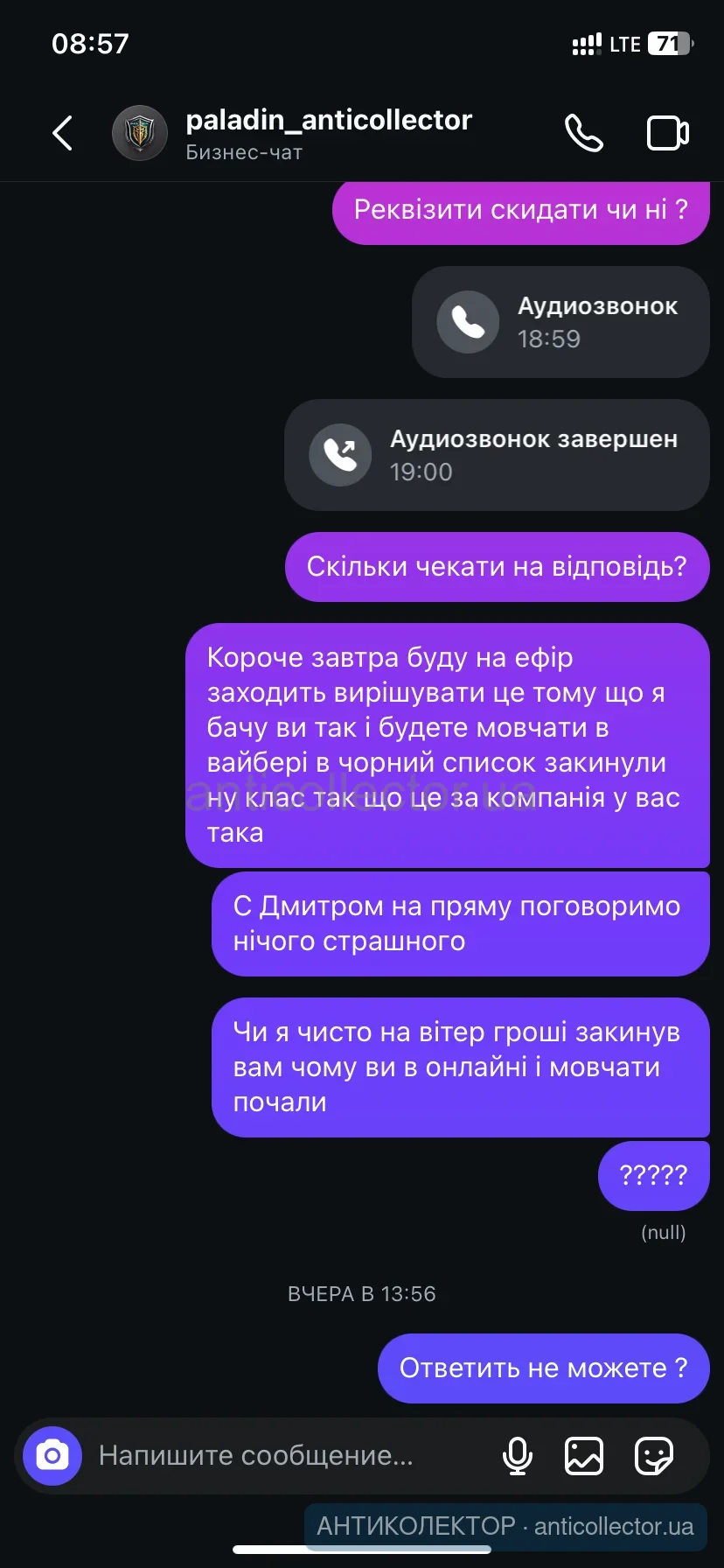 Нашов того Дмитра сьогодні відписав ще на мене сказав буде подавати до суду за натиск і тд короче натиску вообще ніякого не було говорю як є ну компанія ПАЛАДІН шлак