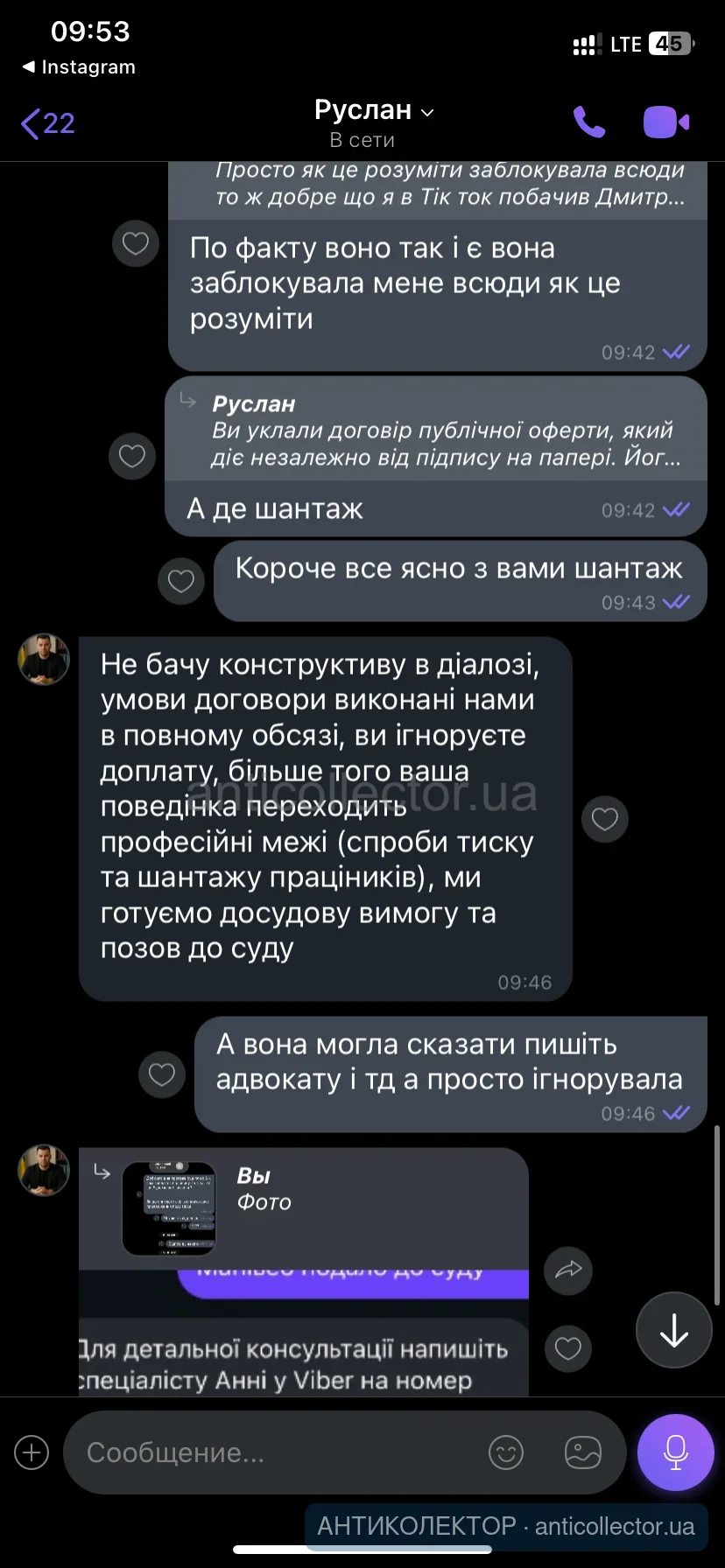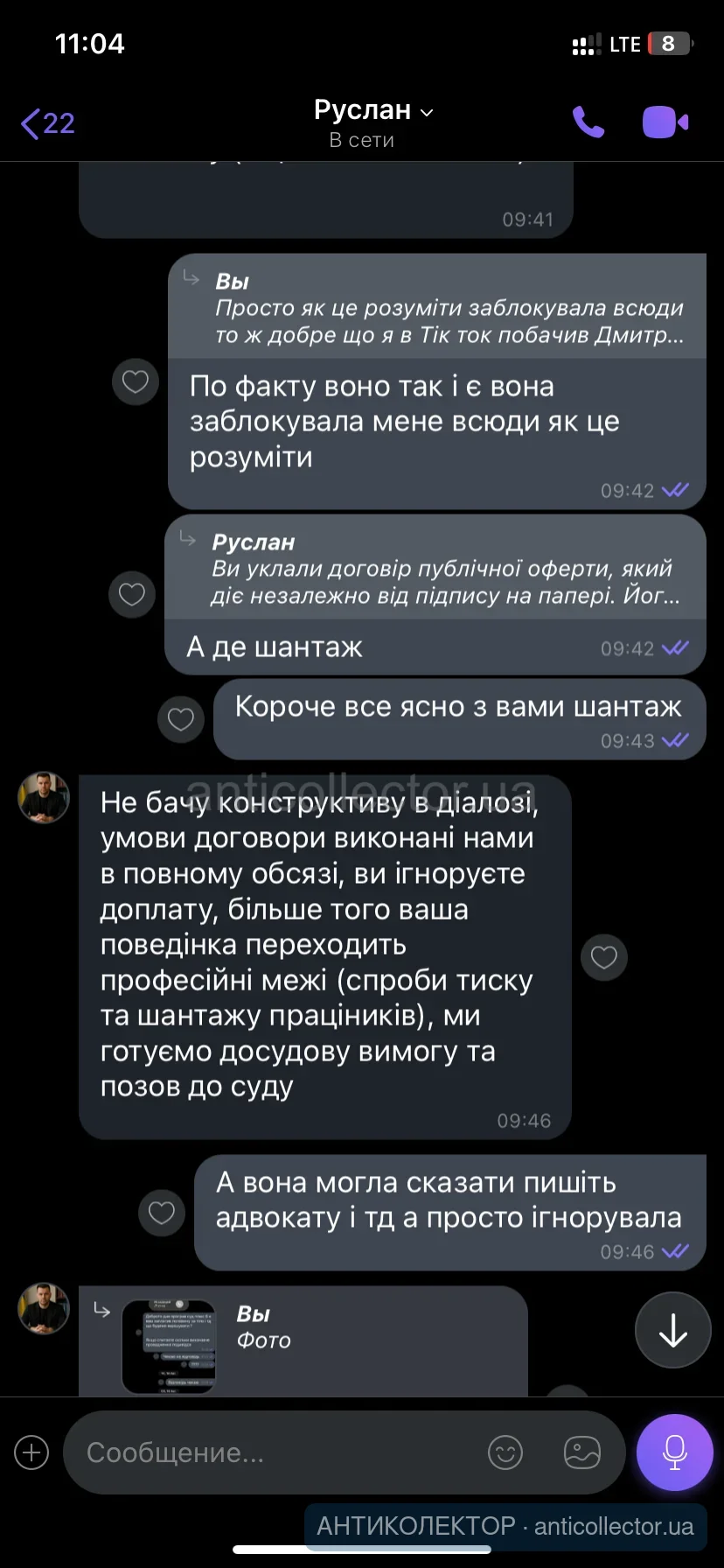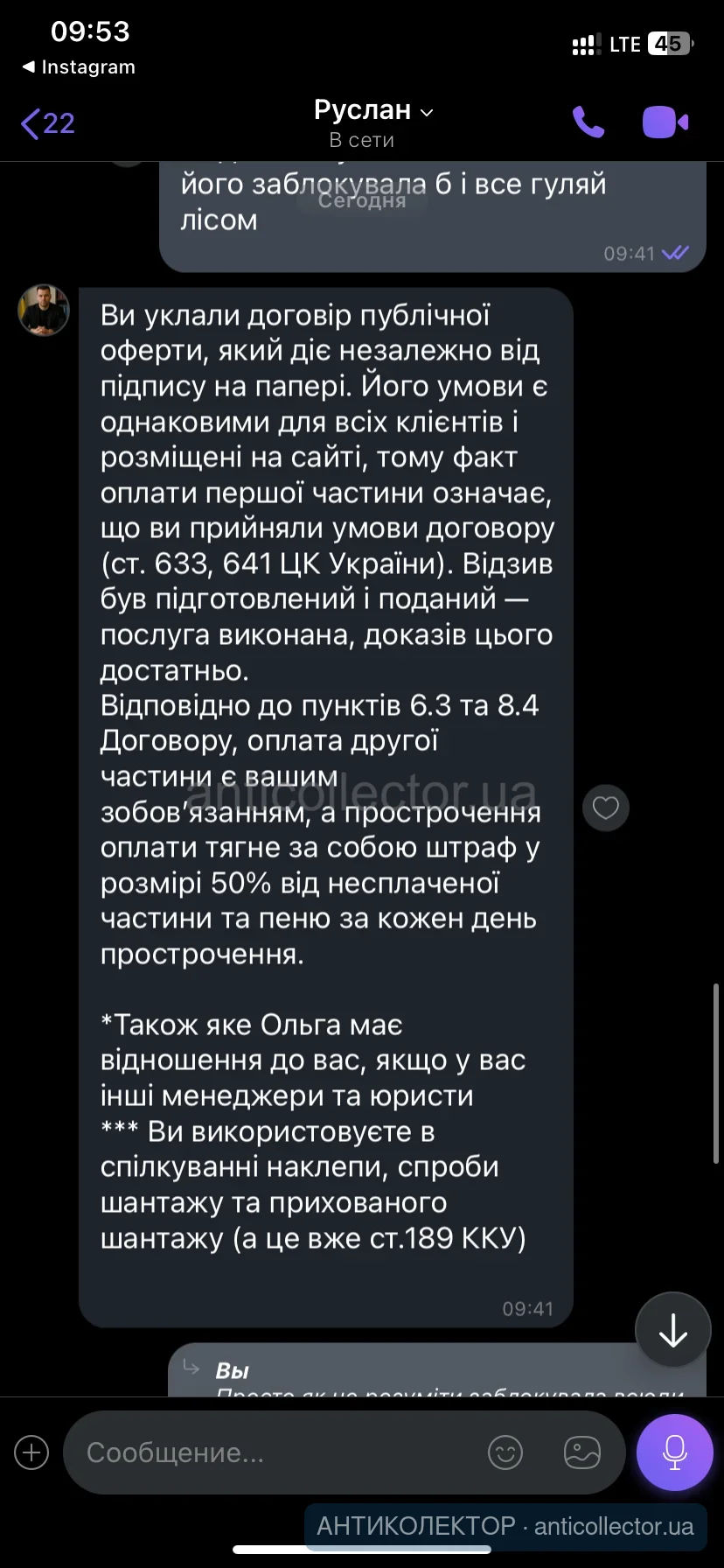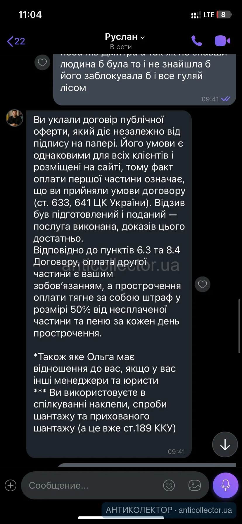 У мене такое така ж проблема тільки я звернуся до них з проханням з судом допомогти 7 тисяч заплатив за відзив плюс за МФО половину 6 тисяч сказав їм побачим що вирішить суд потім оплачу другу половину тиснули щоб я оплатив другу половину 6 тисяч потім я перестав з ними спілкуватися тому що вони уже з оплатою за другу частину почали тиснути писав їм з липня місяця і відповіді не було тільки прочитано пару днів назад на вайбер і в інстаграмі заблокувала так звана Ольга