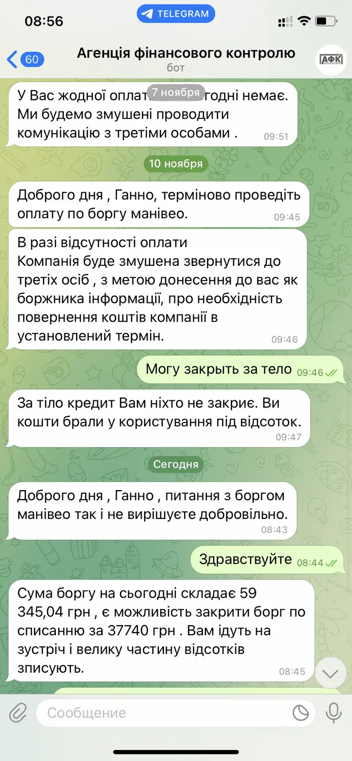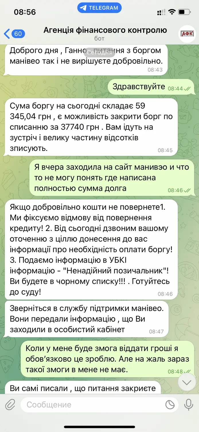 Правильно буде не спілкуватись, а якщо є бажання випустити пар-можете послати відкритим текстомэто манивео отдали я так поняла Таллиону. Я первый раз с таким сталкиваюсь. И сейчас действительно не могу отдать им долг. Но у меня еще есть кредиты в нескольких других. Данные родственников не указывала. Но звонили брату мужа и мужа сестре и мужа маме. Но они все за границей поэтому трубку не берут один брат мужа взял трубку и сказал что он за границей и они тратят его деньги со счета так как роуминг. Мои родителям пока не звонили. Как с ними правильно общаться?