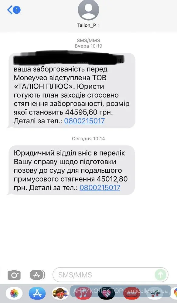 Мені на початку 2021 року почали приходити смс від Таліона. Якийсь там сусід чи не знаю хто взяв кредит. 10к. Продали Таліону. Прийшло чомусь до мене 4 смс за 4 місяці. Перша - погасити 26к, друга -37к., третя -понад 60к. Четверта -11к. не знаю,що був за мужик ,великий боржний , але суму змінювали конкретно. Блін, сама тоді не думала ,що буду ,як той невідомий мені мужчина. Скоро так само будуть людям незнайомим смс писати.