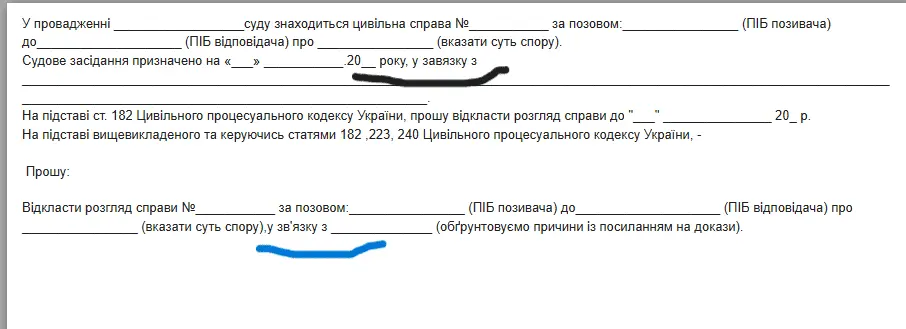 Я так розумію що ось це зразок заяви,підкажить що вказувати в підчеркнутому мною пункті,чи там і там вказувати причину відкладення?