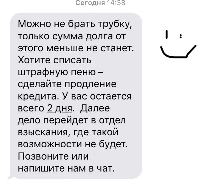 Та пугалка дебильная, согласна)) но все равно иногда страшненько стает. А хуже всего что они брата старшего задалбывают из-за меня,а он потом мне трезвонит и пишет- решай вопрос! Спасибо,за ответПол года и тишина полная была. Я на морозе, только кешбери задрали свои прозвоном (кстати изза этого последнии в очереди с кем решумь что то решать. Им я теперь ничего не должен). Последствий ноль, есть шараги пожеще. Правда фантазия у них какая-то маризматическая. Я бы сказал даже наполеоновская. А по сути сделать они ничего не могут. Много чем пугали.