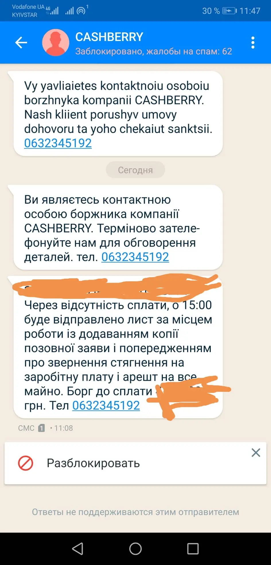 Перші рішення суду на користь CASHBERRY щодо стягнення боргу ухвалено. Строк винесення рішення до 1-го міс. Ваша справа наступна. Копію позовної заяви сьогодні направляємо за адресами реєстрації та роботи. Борг 5 490,00 грн. Тел.0632345192