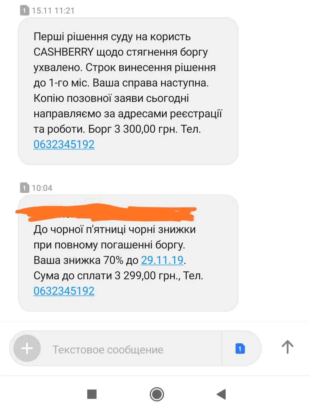 Мне такое смс где-то месяца полтора назад пришло, потом где-то неделю названивал робот с таким же текстом. Но что то до сих пор никакой копии не пришло.С того времени предлагали всякие акции и тому подобное.Перші рішення суду на користь CASHBERRY щодо стягнення боргу ухвалено. Строк винесення рішення до 1-го міс. Ваша справа наступна. Копію позовної заяви сьогодні направляємо за адресами реєстрації та роботи. Борг 5 490,00 грн. Тел.0632345192