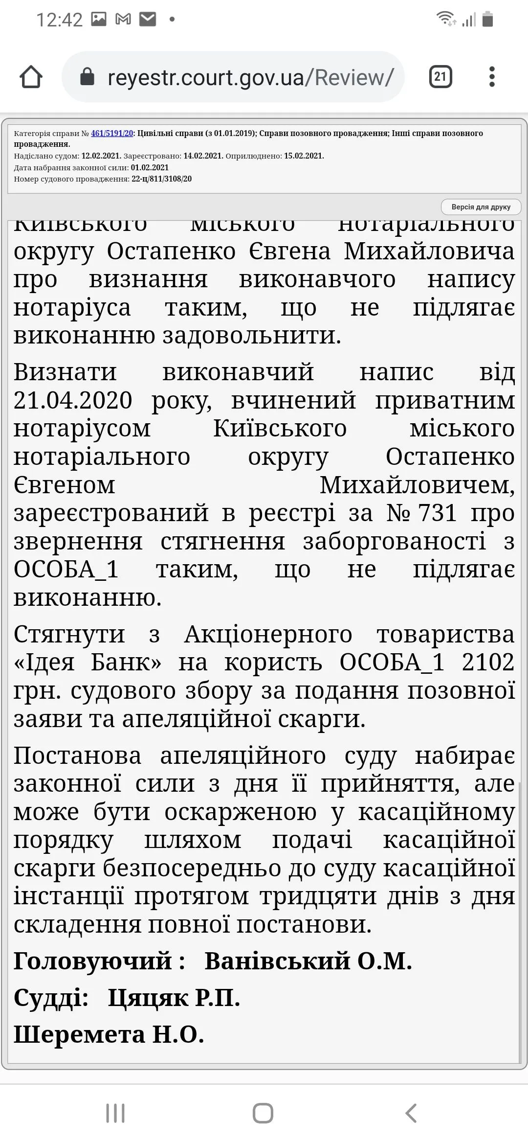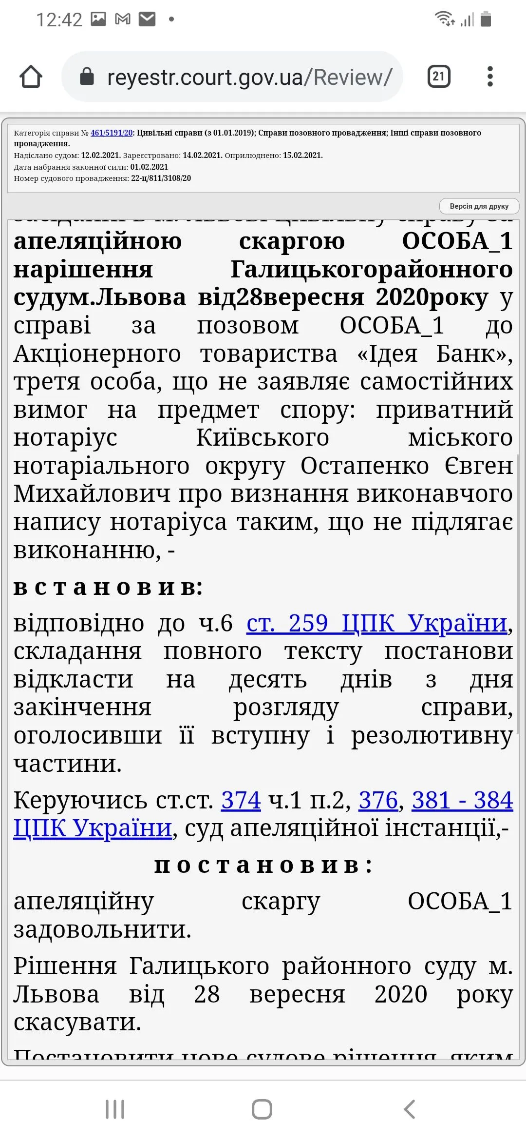Добрый день, дорогие форумчане!!! Делюсь с Вами хорошей новостью, Львовским апелляционным судом было вынесено Постановление о признании ИН такой, которая не подлежит исполнению. ИН была выписана Остапенко по Идее Банку. Первую инстанцию мы проиграли, но не сдались, подали в апелляцию и, вуаля, ПОБЕДА!!!!! Большое спасибо Yurist за грамотную юридическую поддержку, за то, что всегда на связи, за готовность помочь, выслушать, ответить на любой вопрос, даже не касающегося этого дела и абсолютно БЕСПЛАТНО, просто по человечески, за готовность поддержать и наставить на путь по борьбе с ними в правовом поле!!!