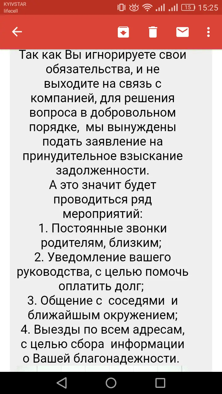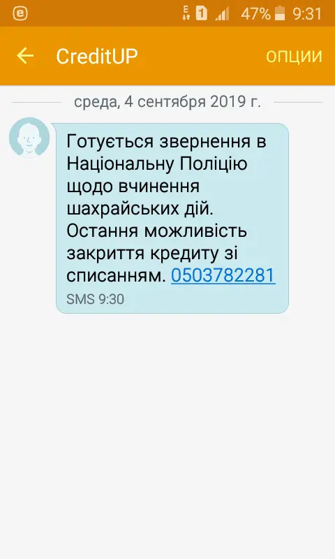 Інформуємо Вас, що ТОВ «CreditUP» проводить комплекс дій спрямованих на погашення кредитної заборгованості. Так як Ви ухиляєтесь від оплати боргу в добровільному порядку, то з боку компанії «CreditUP» були відправлені запити до Єдиних державних реєстрів рухомого/нерухомого майна, а також до Державної Фіскальної служби з метою виявити доходи, на які можна звернути стягнення при відмові від добровільного врегулювання ситуації з боргом. Окрім цього планується здійснити візит за Вашою адресою, разом із працівниками Служби Безпеки та представниками органів МВС з метою перевірки Вашого фінансового та майнового стану.