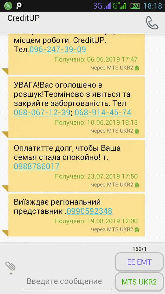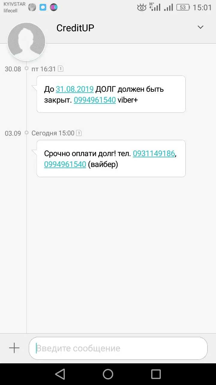 | Інформуємо Вас, що ТОВ «CreditUP» проводить комплекс дій спрямованих на погашення кредитної заборгованості. Так як Ви ухиляєтесь від оплати боргу в добровільному порядку, то з боку компанії «CreditUP» були відправлені запити до Єдиних державних реєстрів рухомого/нерухомого майна, а також до Державної Фіскальної служби з метою виявити доходи, на які можна звернути стягнення при відмові від добровільного врегулювання ситуації з боргом. Окрім цього планується здійснити візит за Вашою адресою, разом із працівниками Служби Безпеки та представниками органів МВС з метою перевірки Вашого фінансового та майнового стану. Візит планується у період із 03.09.2019 р. по 14.09.2019 р., тому просимо Вас бути присутнім за адресою при перевірці майна там мати при собі паспорт громадянина України. Бажано, щоб на момент візиту були присутні всі громадяни, зареєстровані за адресою. У Вас є останній шанс, скористайтесь можливістю закрити борг на лояльних умовах Детальну інформацію про графік візитів Ви можете дізнатись за телефоном: 0931149186 Реквізити: ТОВ «ВЕЛЛФІН», код за ЄДРПОУ 39952398, ПАТ «Альфа Банк», код банка 300346, р/р 26501014770201. В призначені платежу обов'язково зазначте ПІБ, ІПН і телефон боржника. Оплата без авторизації на сайті: необхідно зайти на сайт: - CreditUP - ввести номер телефону або ПІБ боржника, код підтвердження, суму для оплати та номер картки платника. |