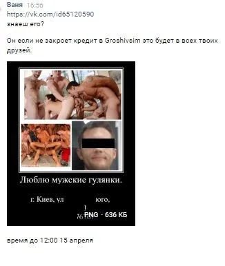 Хочу поделится неприятной историей которая произошла со мной в одной из социальных сетей, Так 14.04.2020 в 16-54 мне пришло сообщение с монтажом моего фото пopнoграфического характера, текст под фото был такой «Ты знаешь его»!? (Ссылка на моего одногрупника, с которым я последний раз виделся в 2006году на выпускном) а дальше текст -Если он до завтра не погасит кредит в «гроши всим» это фото будет разослано всем моим друзьям” Дальше список моих друзей и напоминание что время у меня есть до 12-00 апреля 15 2020 Услугами подобных компаний я никогда в жизни не пользовался, по этому весь разговор заскринил и сохранил. [email protected] Онлайн заявку по факту вимогательства шантажа и неумелого монтажа создал на сайте национальной полиции #218304