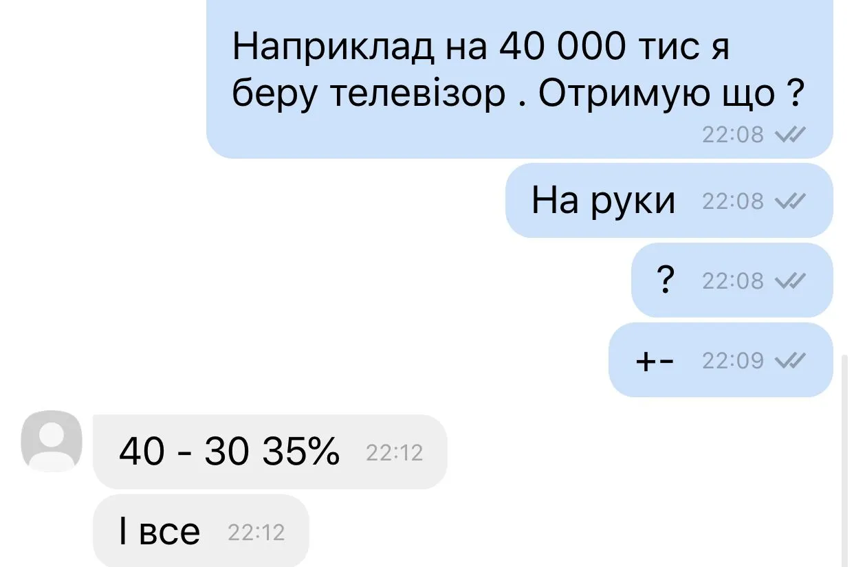 Спросила условия ! Отвечает: в крупных магазинах техники мои «девочки» выдают тебе технику в рассрочку, а я у тебя ее выкупаю . Ты получаешь деньги от меня и выплачиваешь как за технику , а я получаю технику. Первый взнос и все расходы оплачиваю я. Отнимаю потом от твоих денег .