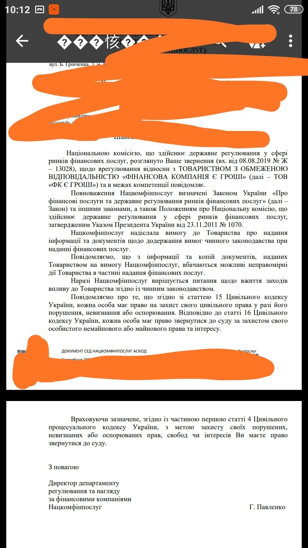 ЦПисала 8.08.19 в нацкомфин на гроші всім,кредитон,топ кредит(сейчас это всё Верона). 21.08.19 получила ответ,о том что договор не действительный,двусторонняя реституция, естественно,меня это порадовало,НО, в своем ответе нацкомфин не указал номер договора!! Вот теперь жду остальные ответы,что б разобраться. Звонила в верону, они ни о каком ответе от нацкомфина не знают,но предложили списание части кредита. Смешные, брала 3600,пролонгациями оплатила 8000, сейчас просят 11000 и кредит закроют. Жду когда решение появится на сайте нацкомфина. Все равно не пойму,почему номер договора не написан.