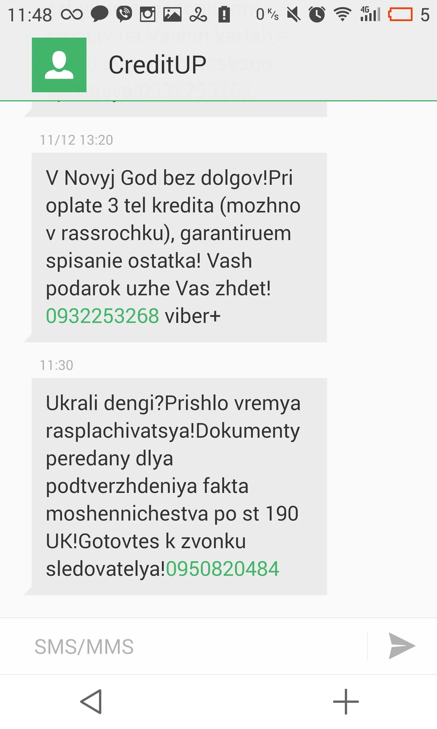 У них что сегодня оборонне предновогоднее. Прислали только что. Зат.......хали уже. Otrimani kontaktni dani vashogo otochennya, zvertayemos za dopomogoyu oplatiti vash kredit.Detali 0800603561, 0932253268,0950820484 Creditup