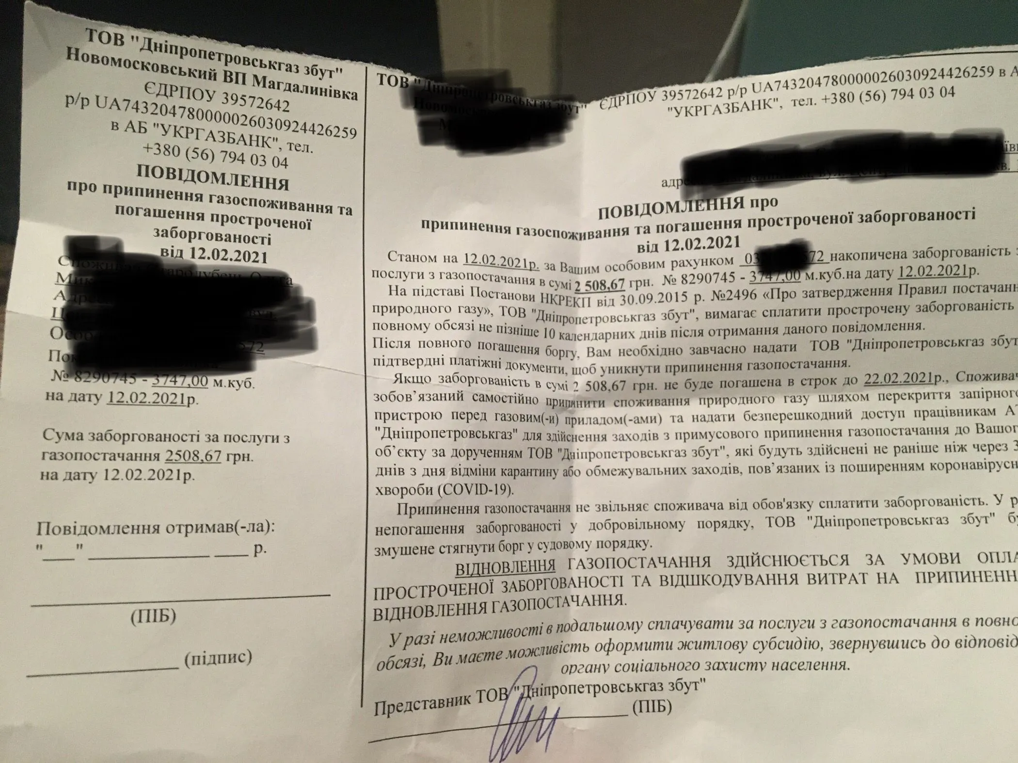 Доброї ночі!) сьогодні зранку на підвіконні у під’їзді поклали працівники газового господарства повідомлення про припинення газоспоживання через заборгованість! Сьогодні 21.02, а в листі написано, що 22.02 припиняють постачання! Ні прізвища немає, хто представник з газу, тільки підпис! Це можна вважати як залякування? Ніхто не відключить?
